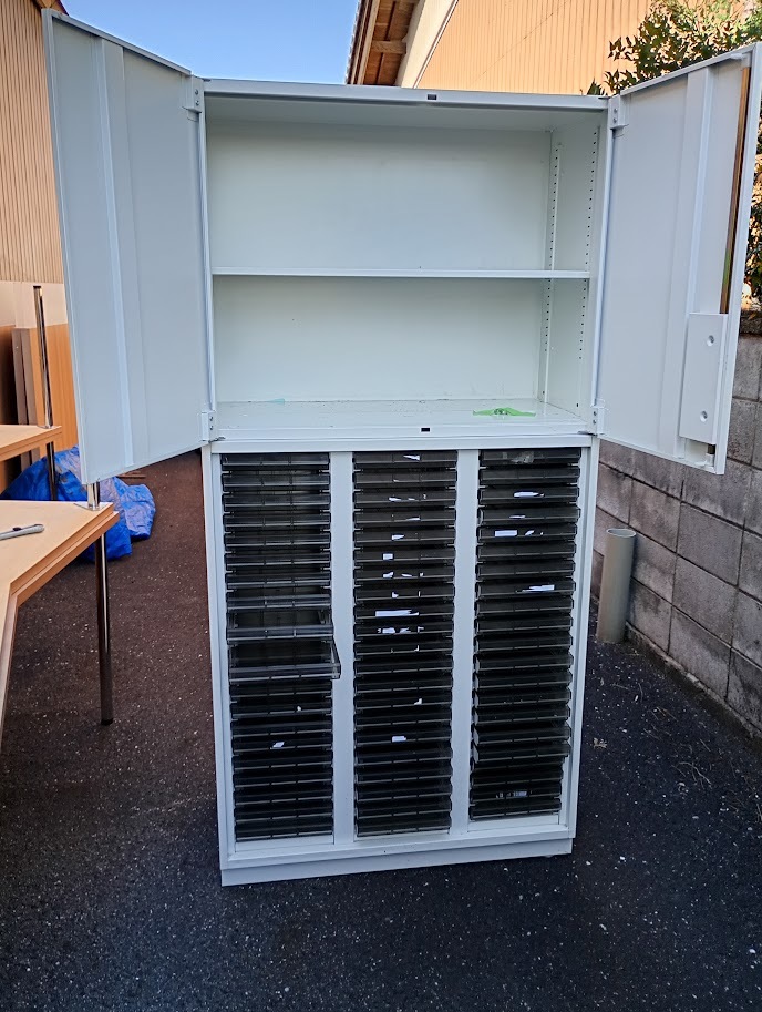 ・上下2分割できます。連結用の穴などの加工があります。ヘコミ等あります。レターケースはA4の21段×3列です。上下の2個口発送となります。
