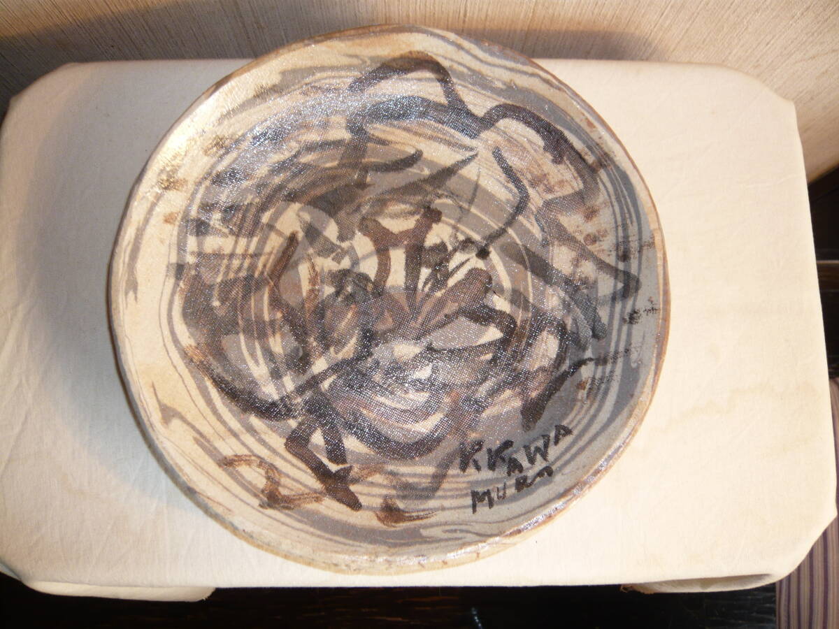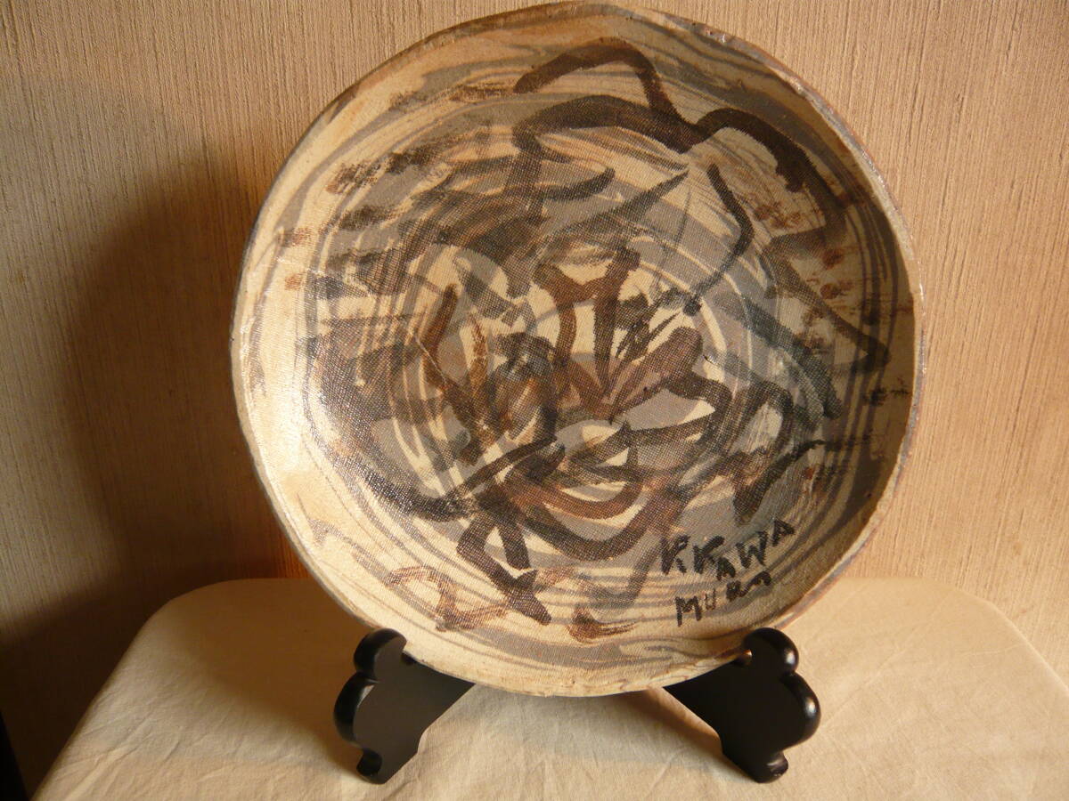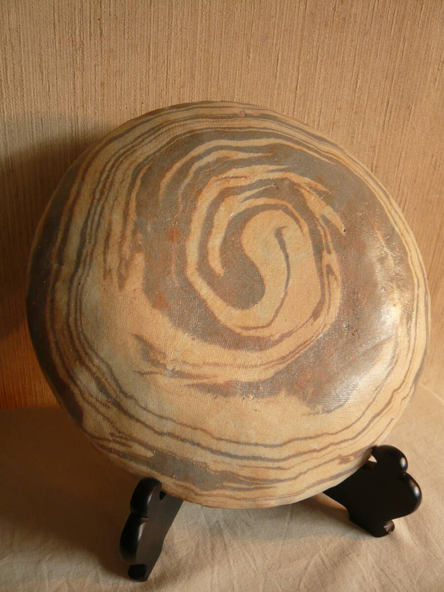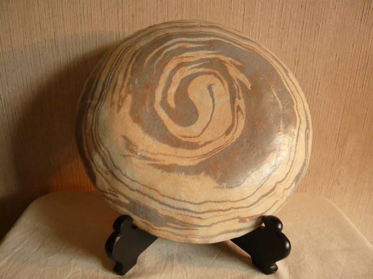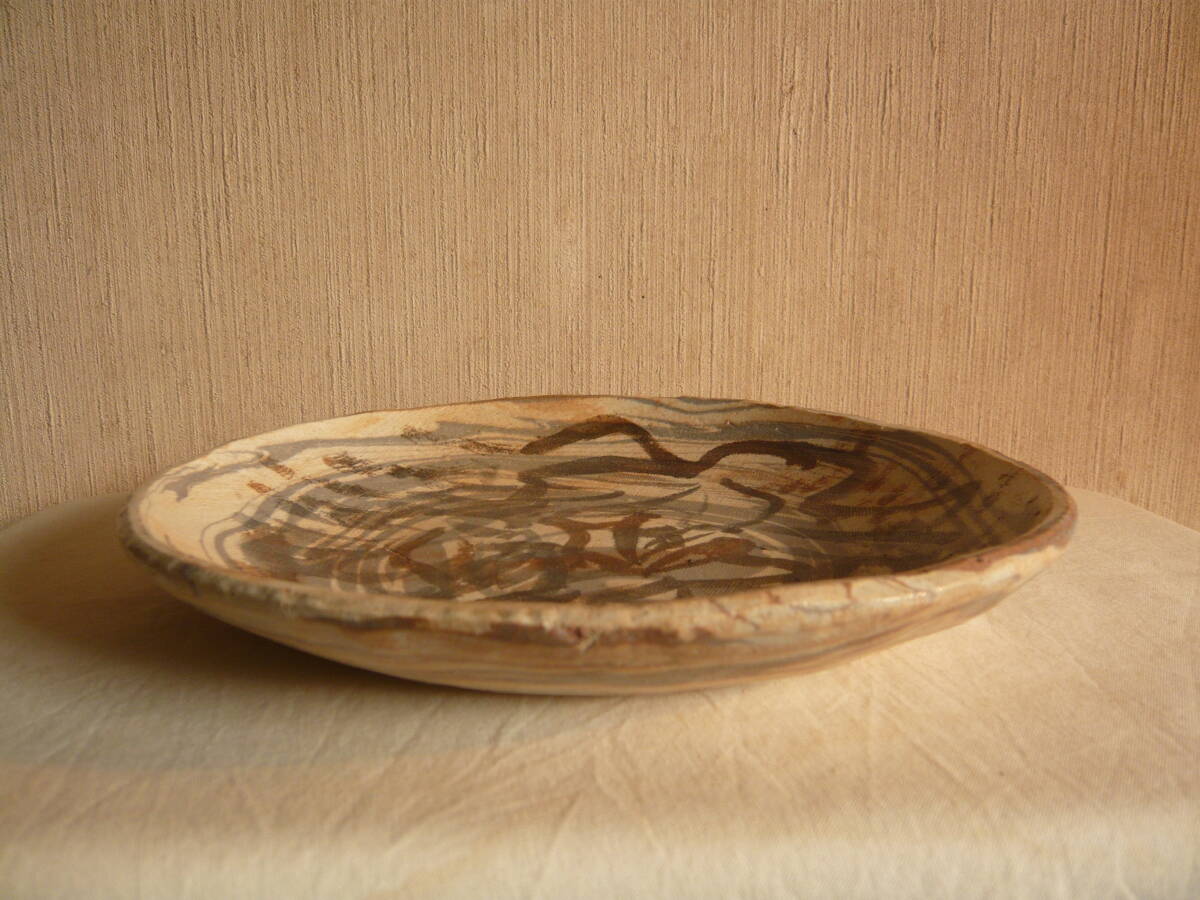 前所有者は、瀬戸の陶芸家 水野寿山さんのファンで生前沢山の作品を保有されていて、その中にあった内の「練り込み皿」です。これは作家がその方のために作成された皿で、皿の右下にその方の名前が書きこまれています(為書き)。作家の作品には、普通「寿山」という落いんが押されていますが、この作品にはそれがありません。しかし、作家も所有者方を訪問されるなど、二人の親密な関係から、作家の作品に間違いとの話です。 皿のサイズは、直径約23.5センチ、高さ約3センチで、傷はありません。