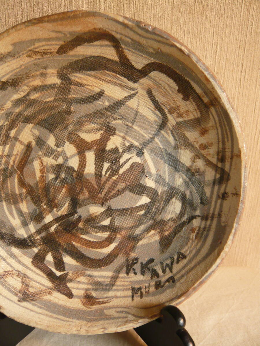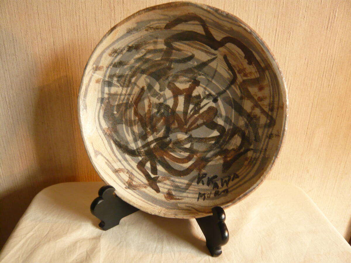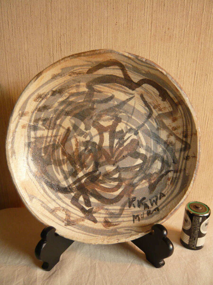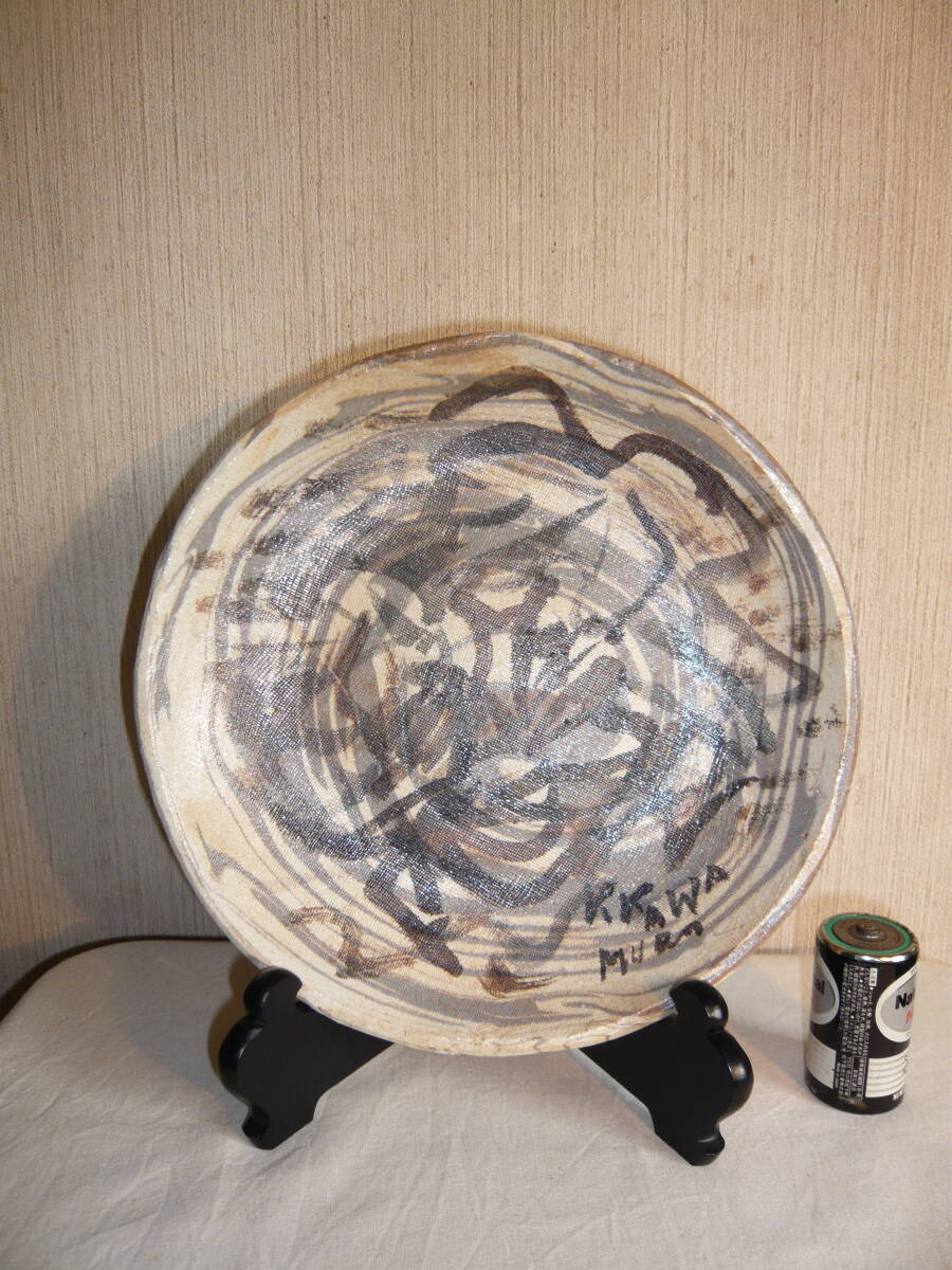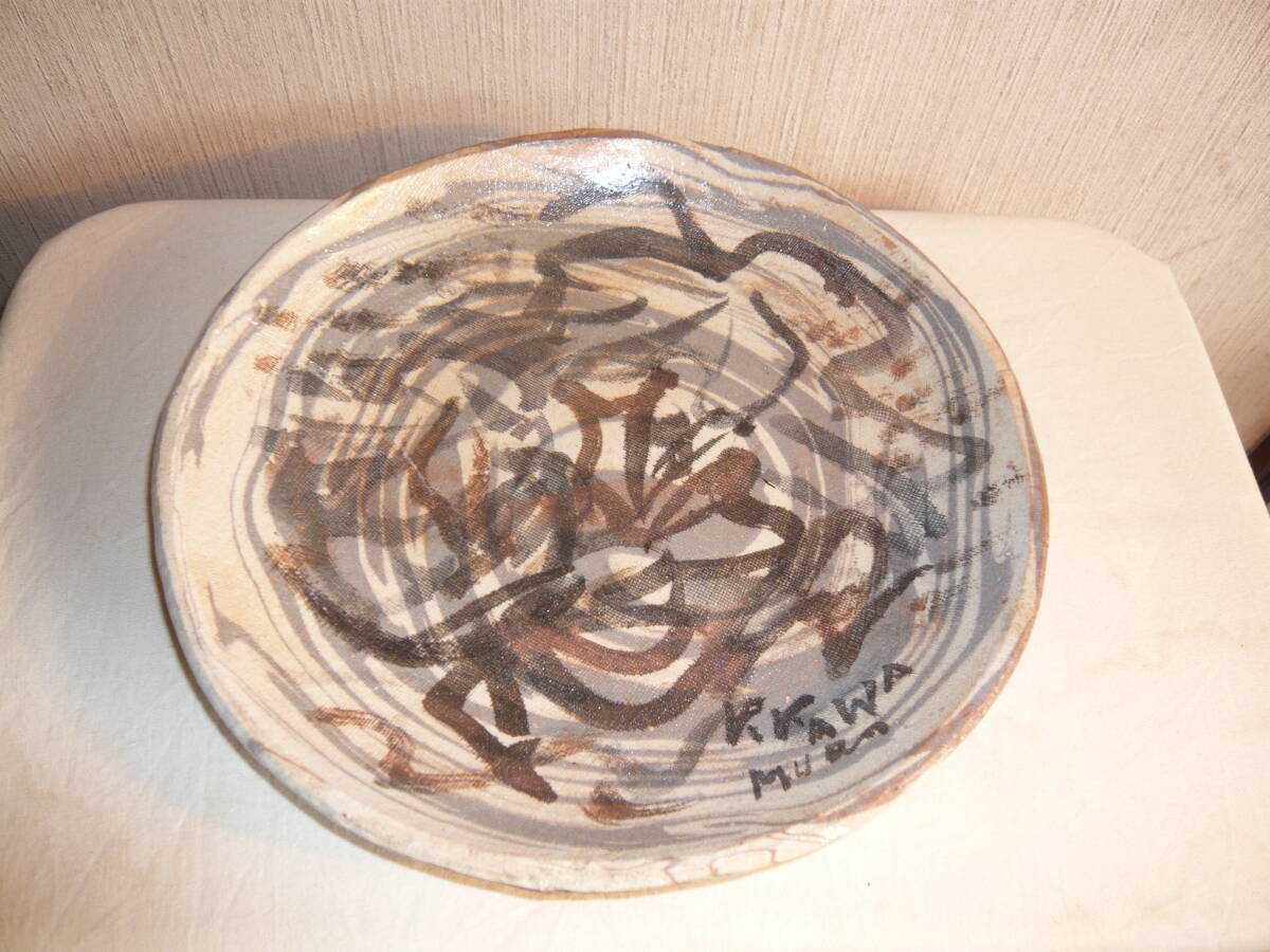 前所有者は、瀬戸の陶芸家 水野寿山さんのファンで生前沢山の作品を保有されていて、その中にあった内の「練り込み皿」です。これは作家がその方のために作成された皿で、皿の右下にその方の名前が書きこまれています(為書き)。作家の作品には、普通「寿山」という落いんが押されていますが、この作品にはそれがありません。しかし、作家も所有者方を訪問されるなど、二人の親密な関係から、作家の作品に間違いとの話です。 皿のサイズは、直径約23.5センチ、高さ約3センチで、傷はありません。