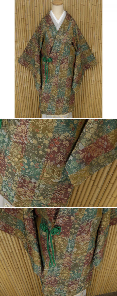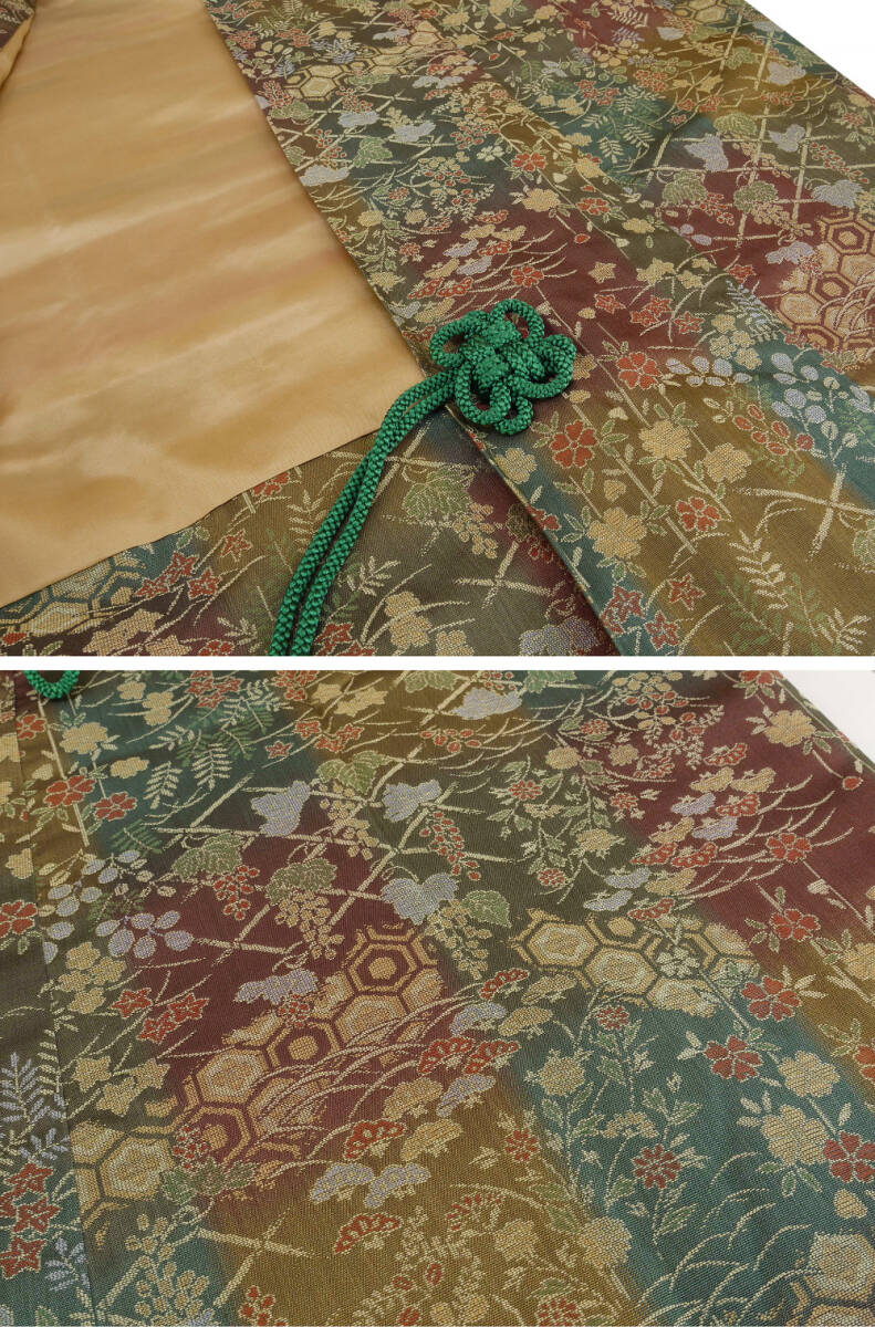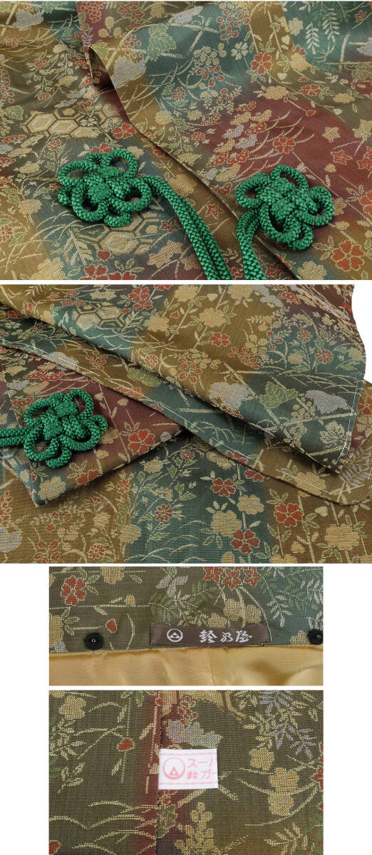 正絹 ●―――――――――――― コメント ――――――――――――― 能衣装 ロング道中着コート 「鈴乃屋謹製 スーパーガード」 躾糸付未着用 ちょっとしたお出かけはもちろん、お茶会などの席に着られると、 日本の伝統美が伝わってくるような美しい雰囲気が漂うと思います。 見れば見るほど味わい深い、お色の調和、 繊細で趣きのある意匠、色使い、それらが上質の地風に一際際立つ、 存在感のあるひと品に仕上がっております。 さらに他のコート地に比べ暖かいので、 実用面でもとても優れているコートです! 年齢を問わずに末永く御召しになっていただけるコートとしてお勧めしたい逸品です。 着用年齢 ご年齢に関わらず永くお召しになって頂けるお品です。 合わせる帯や小物によっても印象が変わりますので、 お好みのコーディネートをお楽しみください。 合わせるお着物 フォーマルからセミフォーマルなお着物に合うデザインです。 「防寒」としてはもちろんのこと、 外出する時は、お着物や帯を汚さないように 「塵除け」としてもコートを着用するのがおすすめです。 躾糸付未着用 の綺麗な美品のお品でございます。 現物は画像以上に色合い・生地共に素晴らしいものですので、この機会に是非ともどうぞ! 格安でお安く出品致します。即決は送料無料となっております。是非この機会にいかがでしょうか。 |