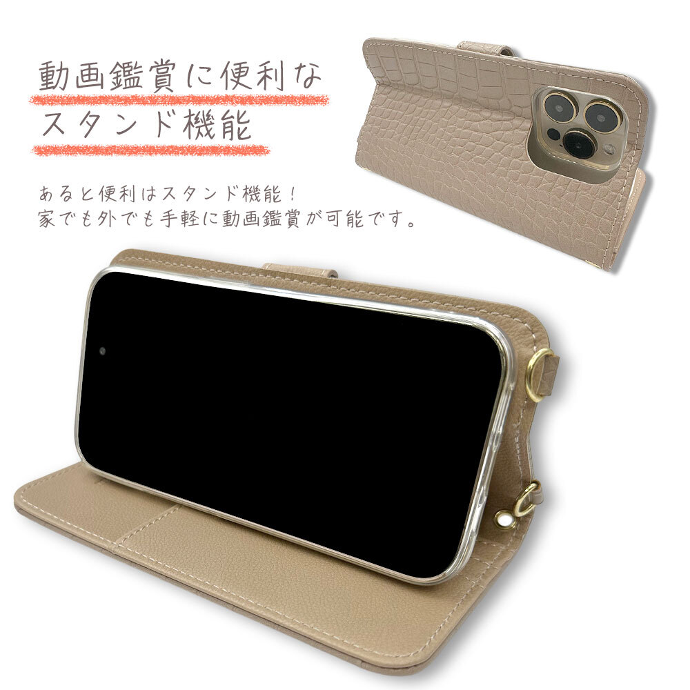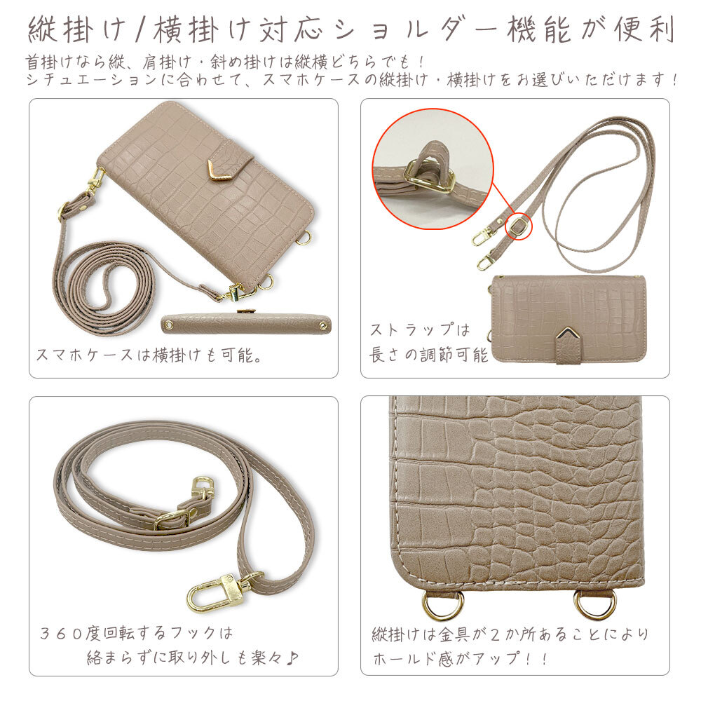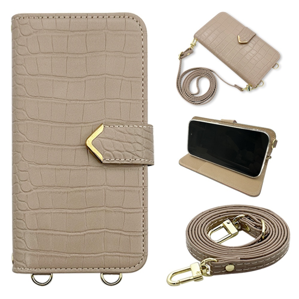 LG K50 対応 スマホショルダー 手帳型 ケース (グレージュ) myones 斜めがけ ストラップ 付き クロコ柄 型押し ワニ革調 スタンド機能 落下防止 カード収納 ニュアンスカラー くすみカラー PUレザー