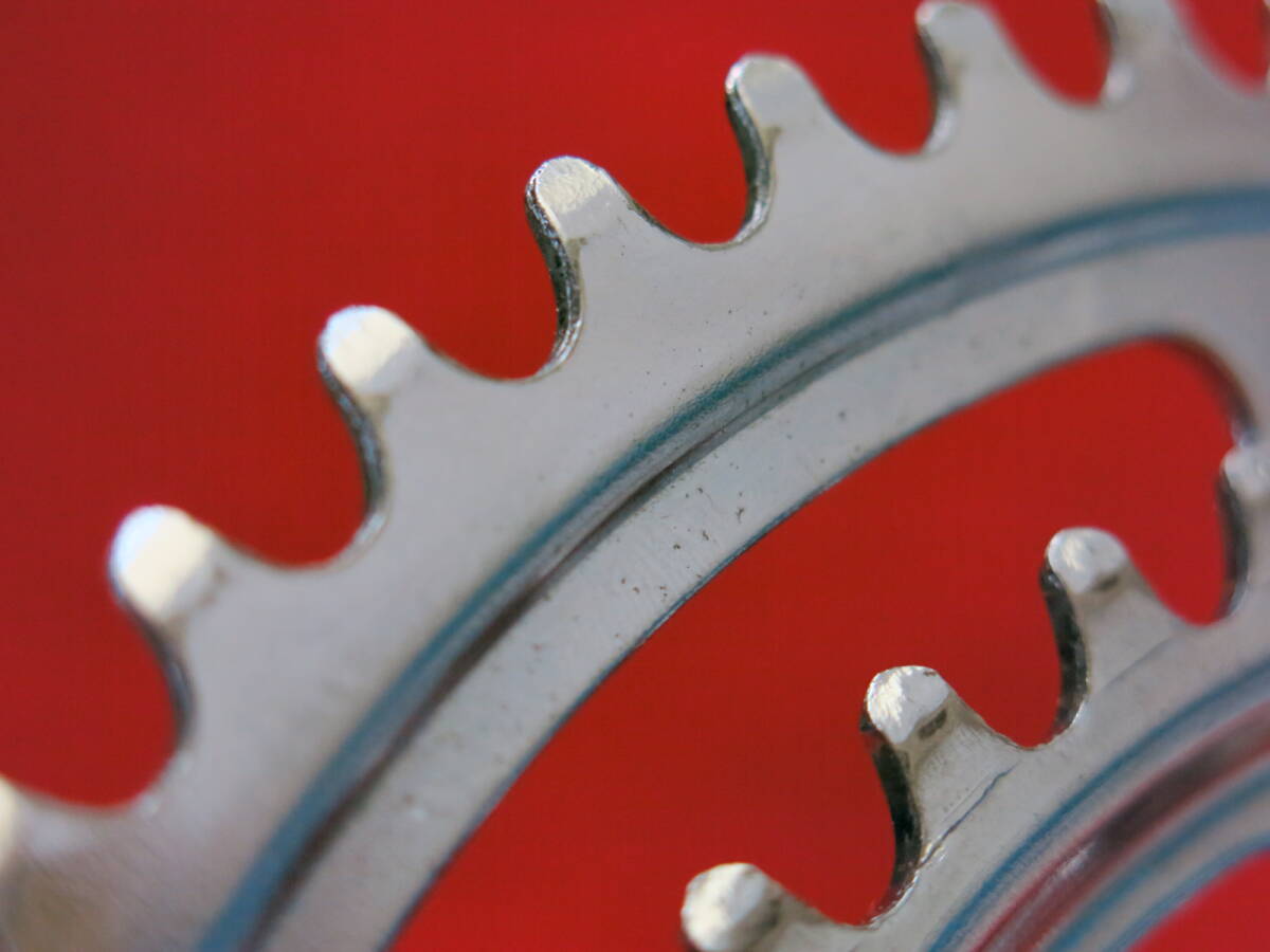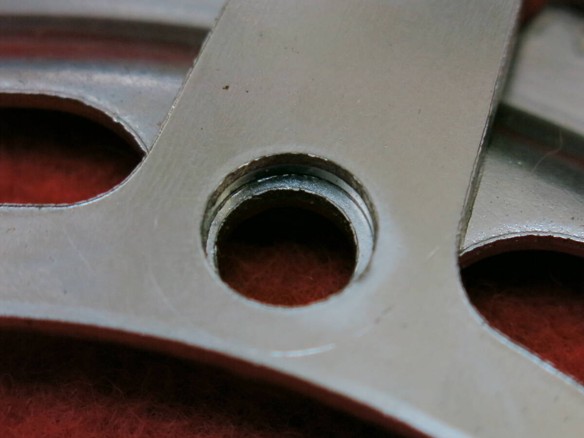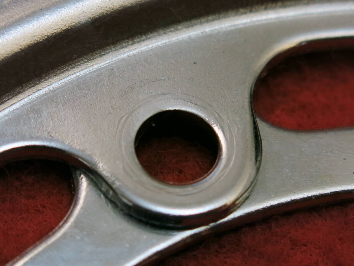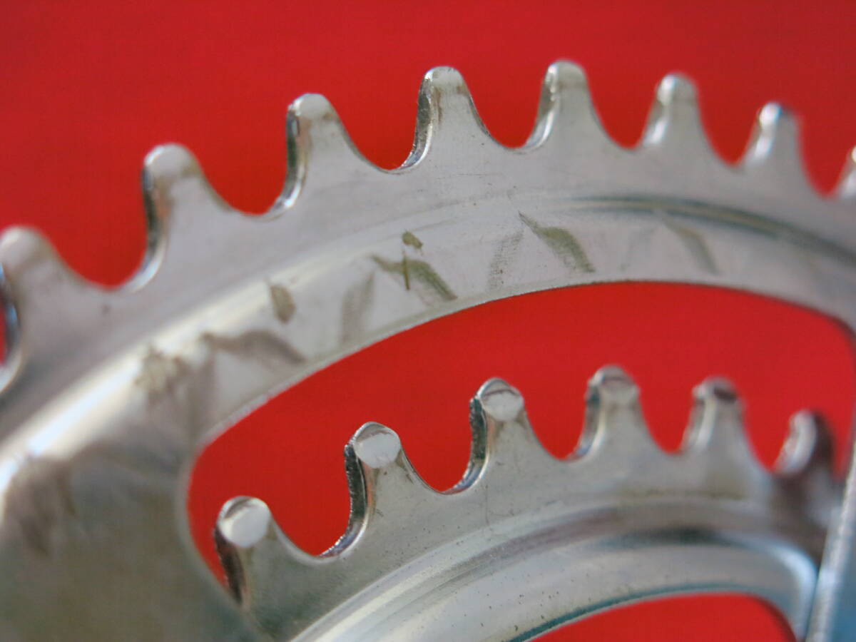 あちこちにキズ、サビ有り。歯にチェーンの跡、摩耗あり。チェーンリングピン径アウター側:約9.1mm、インナー側:約7.5mm。