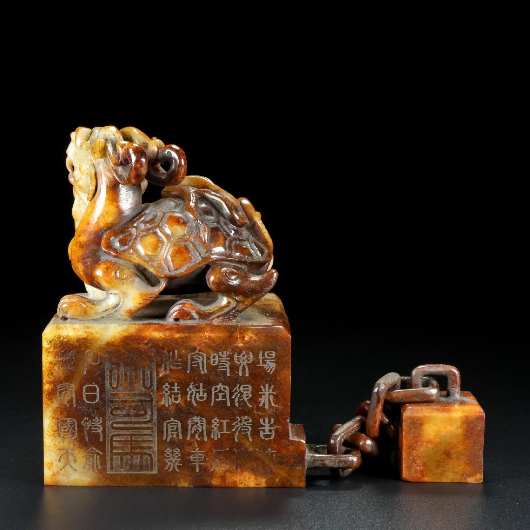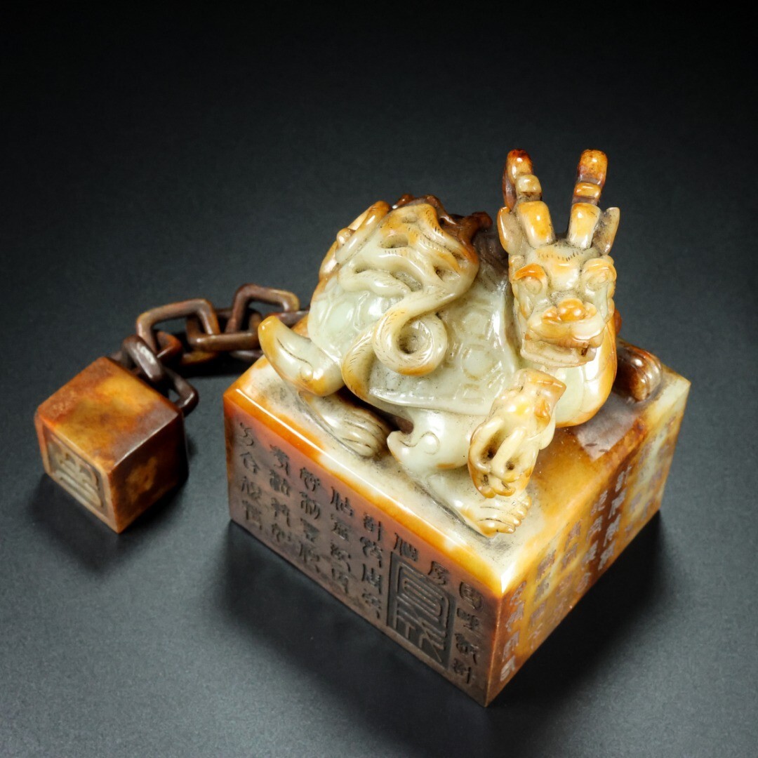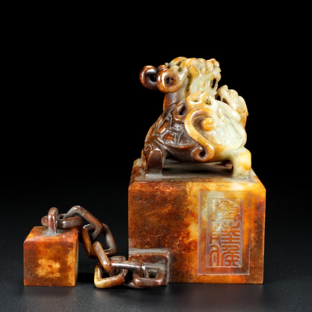 「時代物 和田玉 高古玉彫り 鏈條龍竜鈕印章」極細工 擺件 中国古賞物 古美術 旧蔵出