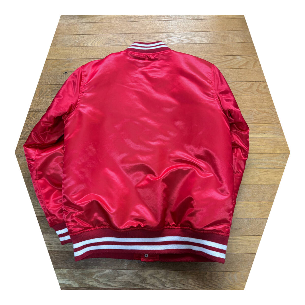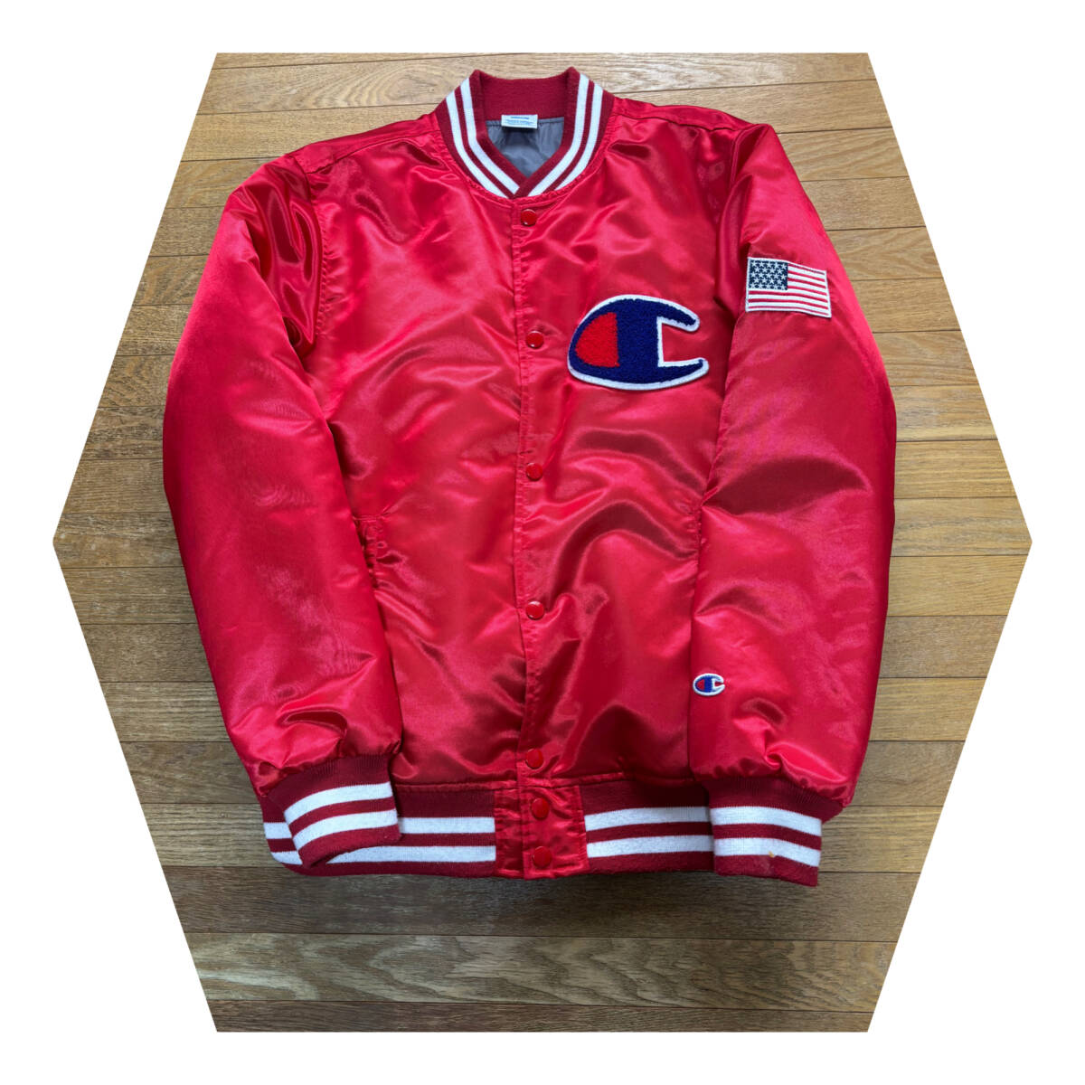 Champion チャンピオン ビッグロゴ サテンスタジャンです。カラーは希少なレッド サイズはM(身幅55cm/着丈66cm/肩幅45cm/袖丈63cm/素人計測のため多少の誤差はご了承ください) 状態はUSEDで使用感はありますがダメージになるような目立つ汚れも無く使用する分には特に問題は無いかと思います。