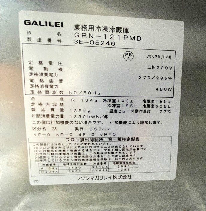 | 製品名 AA-146 フクシマ 業務用冷凍冷蔵庫 4ドア 1凍3蔵 GRN-121PMD 23年製 三相200V 1200×655×1950mm 店舗用品 中古 厨房 |
