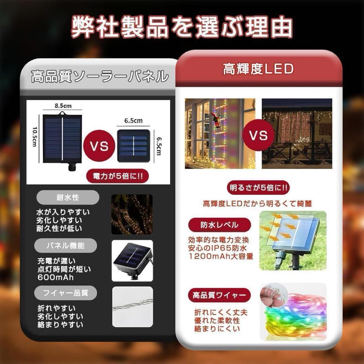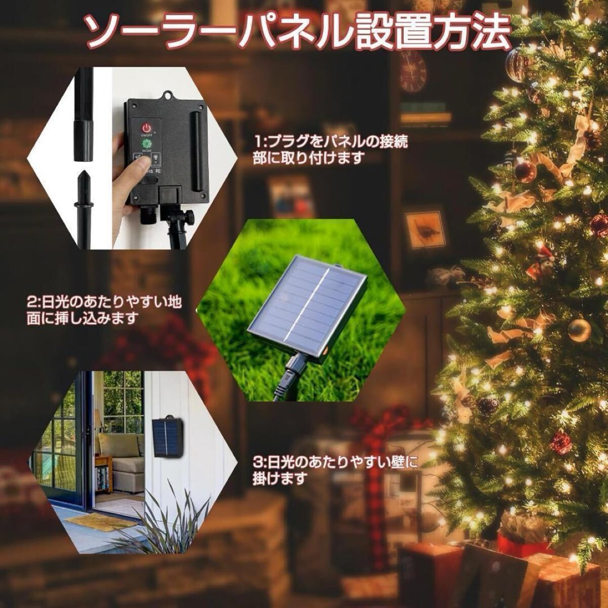 8種類の点灯パターン】ソーラーパネルから電源ON/OFFします。2種モード調整方法があります。第1種:ソーラーパネルのモードボタンを押すと、点灯モードを簡単に切り替えることができます。第2種:リモコンで8つのモードに切り替わります。点灯パターンの変更、ライトの輝度、消灯、タイマーなどの機能を設定できます。8つのモード多彩な点灯パターンが楽しめます。またモード記憶機能も付き、ライトの電源を切っても、次回も前回と同じ点灯モードで光ります。8モード/7輝度レベル(3タイミング機能(6時間、8時間、タイマーオフ)マルチカラー:赤、青、緑、黄4色ミックス。ひとつひとつのLEDがカラフルに優しく光り輝いて幻想的でロマンチックな空間を演出します。クリスマスやパーテイーの飾り付けに、お部屋や窓辺の間接照明・インテリアとして、テラスやお庭のアクセントやライトアップにぜひ!バレンタインデーやクリスマス、新年、誕生日、家族パーティー、ツリー 飾り付け 庭 ガーデン 芝生 植え込みに飾りつけのイメージに合わせ不雰囲気が作ります。