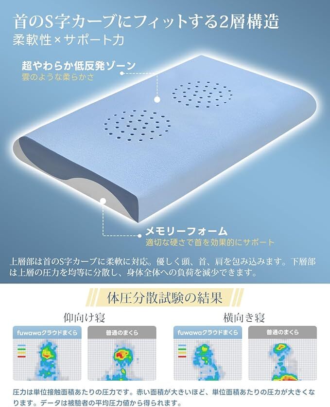 【NASA開発素材で首や肩への負担を軽減】ドイツBASF(バスフ)の45Dメモリーフォームを採用、頭の形通りで沈むため、寝姿勢が変わるたびに合わせて頭と首を包み込んでくれます。柔らかな包み込みにより、頭部と首の負担の優しく分散。横たわると、まるで雲の上に寝るように、あっという間に深い眠りへと誘ってくれます。