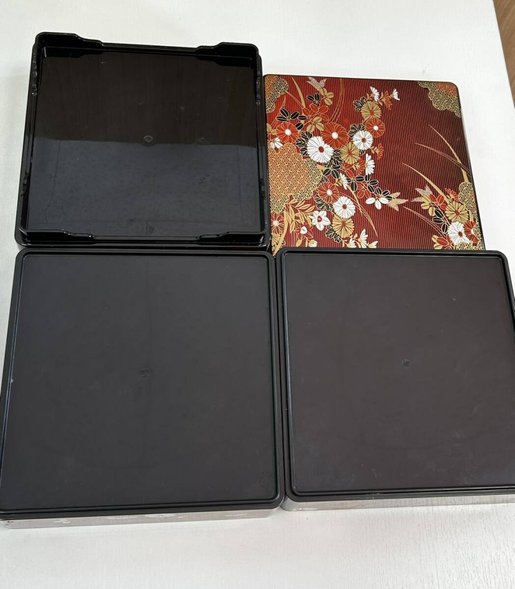 | ご覧いただきましてありがとうございます。 三段重箱 合成漆器 山中漆器 昭和レトロ 20×20×5㎝サイズが3段になります。 未使用品ですが長期保管品です。 元箱は経年劣化で破れ等がございます。 状態は写真でご確認ください。 一度人の手に渡っていますので、 気になる方は購入お控えください。 発送は、配送料が減るよう箱に直接プチプチを巻いて発送致します。60サイズ | |||