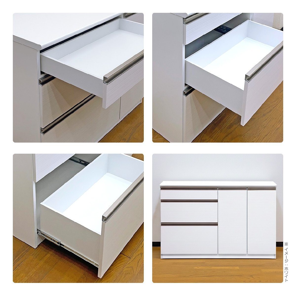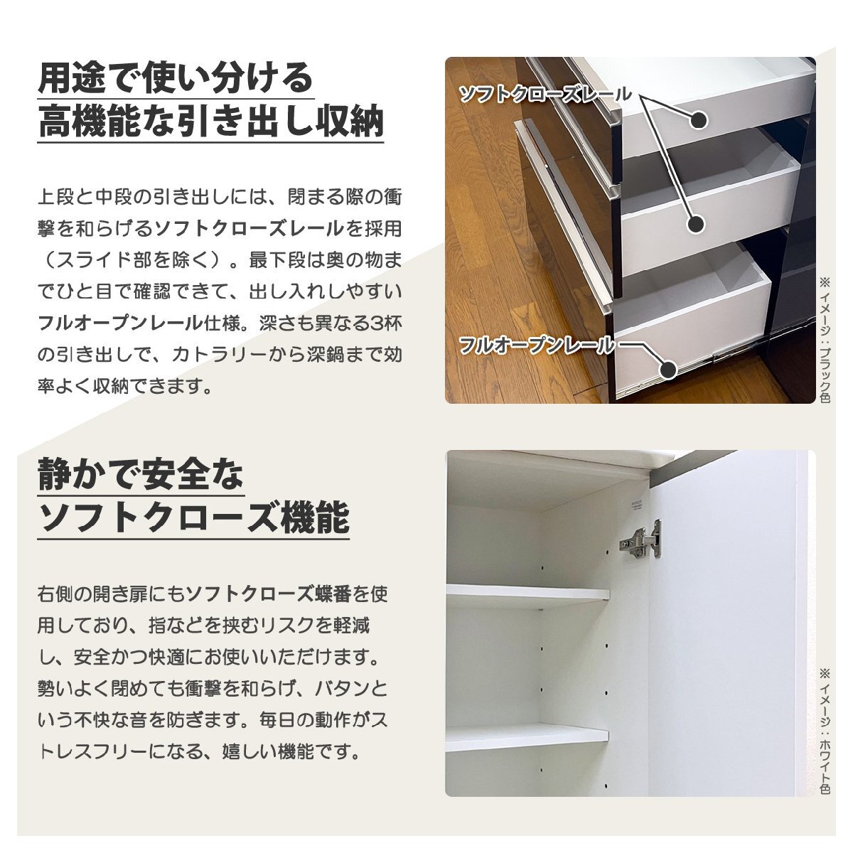 静かに閉まるソフトクローズ、奥まで見やすいフルオープンレール搭載で収納も快適。背面化粧仕上げで間仕切りにも。