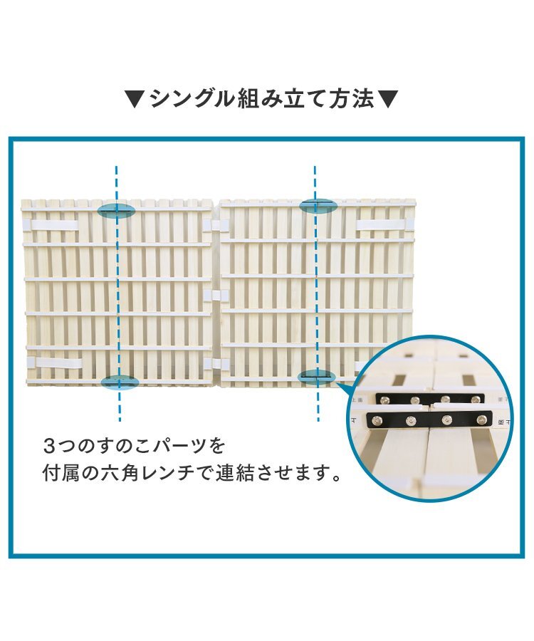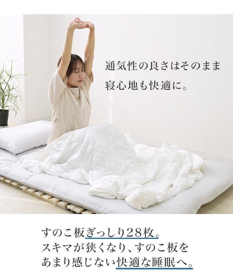 すのこマットで湿気対策! 通気性抜群で湿気を抑制します。 風を通しやすい極厚4cm。 床からの高さを設けることで通気性を高めています。 2つ折りなのでそのまま布団を簡単に室内干しができ、使わない時はコンパクトに収納可能。 天然の桐材を使用。抗菌・防虫・防腐効果があります。 桐は、断熱性と保温性に優れ、寝具を床の冷たさから守ります。 安全性を考慮してマットの角には面取り加工が施されています。 さらに床の傷つきを防ぐためのクッション材付き!。 家族みんなで安心して使えます。 【商品仕様】 タイプ:リブなし/セミダブル カラー:ナチュラル サイズ:(約)幅120×奥行き196×高さ4cm 重量:(約)約9kg 素材:天然木(桐材)、EVA 他 【注意事項】 ・商品は、モニターによって色合いが異なって見える場合があります。 ・仕様・デザインは改良のため予告なく変更することがあります。 |
