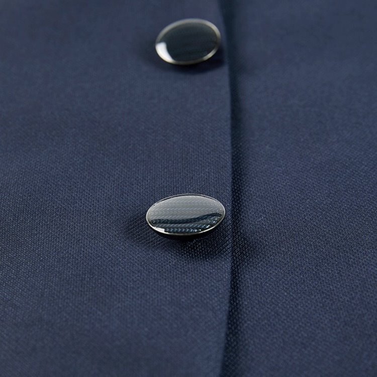 ネイビーの上品さが引き立つ紳士服仕様。シンプルながらも信頼感を与える、実用性重視のセットアップスーツ。