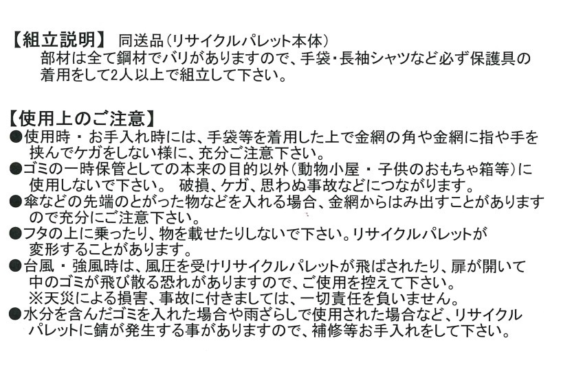 商品詳細 | この度は数ある商品の中から当商品を閲覧頂きまして、有難う御座います。 販売価格 34,200円(送料・税込み) 折り畳みが簡単で収納時には場所を取りません。 メッシュ構造で中身が一目で判り安心。 表面処理はKSGメッキ仕上げに改良され、更にサビにくく、耐久性が抜群です。 (以前の溶融亜鉛メッキに比べて可動部分・細部に均等で滑らかな仕上げができ、 塗膜の剥がれやトゲ、バリなどが発生しにくくなりました。) 組立て完成品でお届け致しますので、届いたその日からお使い頂けます。 商品名:リサイクルボックス大型タイプ GP-800K サイズ:幅1500mm×奥行700mm×高さ800mm 容量:800リットル(45Lゴミ袋:約16袋) 重量:37キロ 網ピッチ:2.5Φ 上半分・底:50mm×50mm 下半分・フタ:50mm×25mm 材質:スチール製、表面処理:KSGメッキ仕上げ 仕様:仕切り板無し、上部全面と正面上半分が開きます。 ※完成品を折り畳んだ状態でお届け致します。組立てに工具は不要です。 梱包なしの状態で出荷、また、重量物のため車上お渡しとなります。ご了承下さい。 |