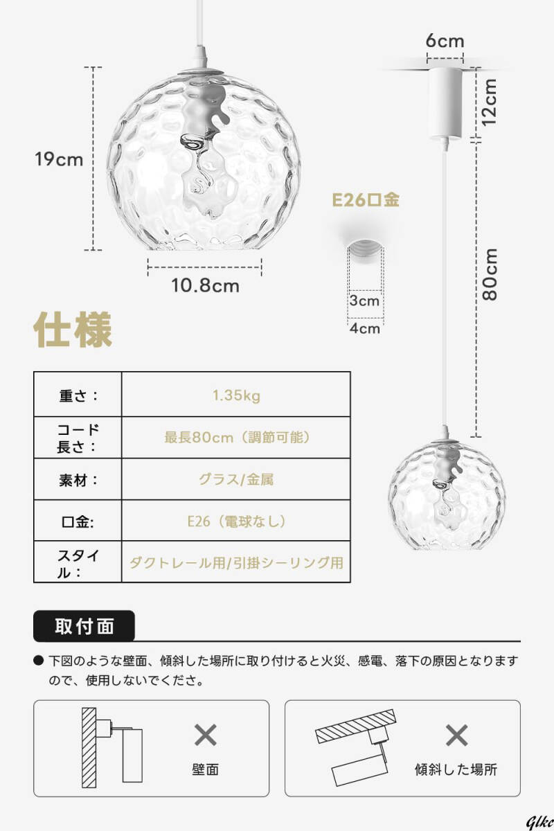 ・電球口金:E26(電球別売、最大60Wまで、LED対応)