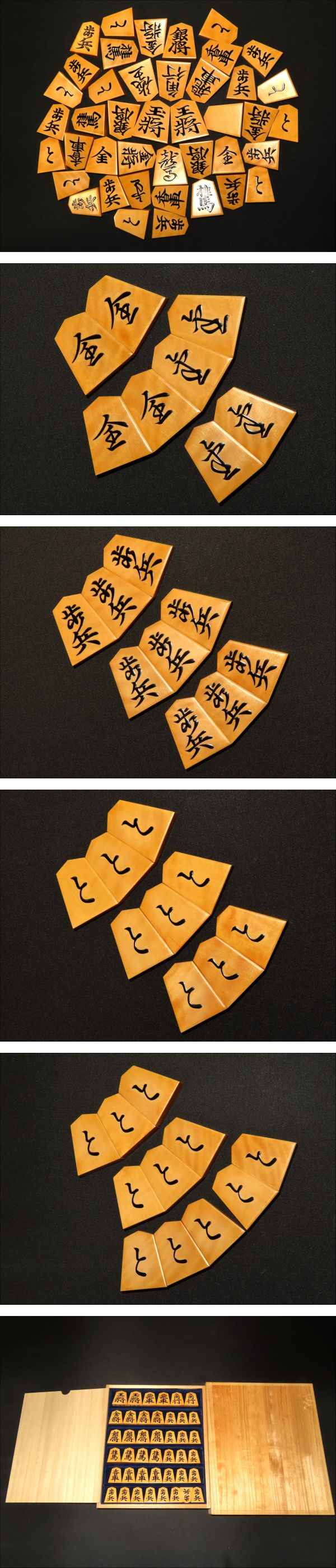 木地は御蔵島黄楊虎斑。御覧の通り非常に味の良い木地です。全ての駒の表裏をUPいたしましたので是非ご覧ください。
