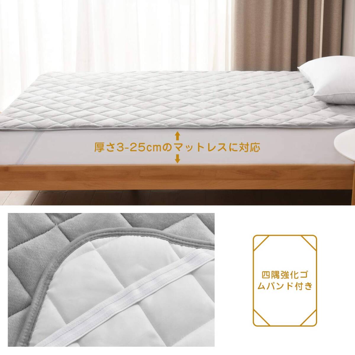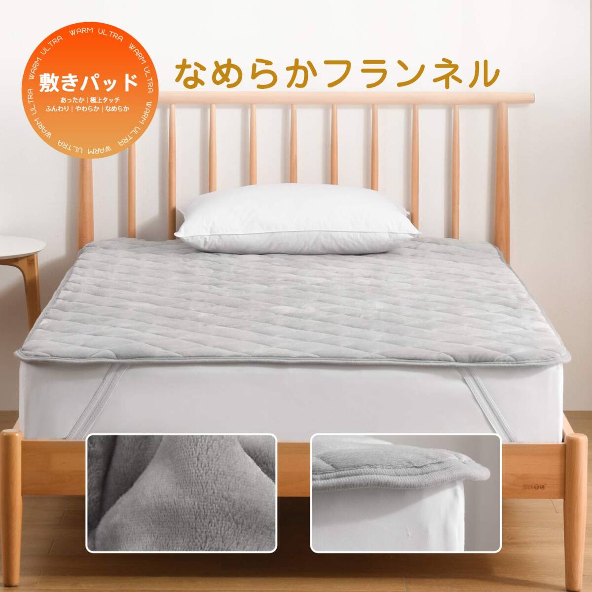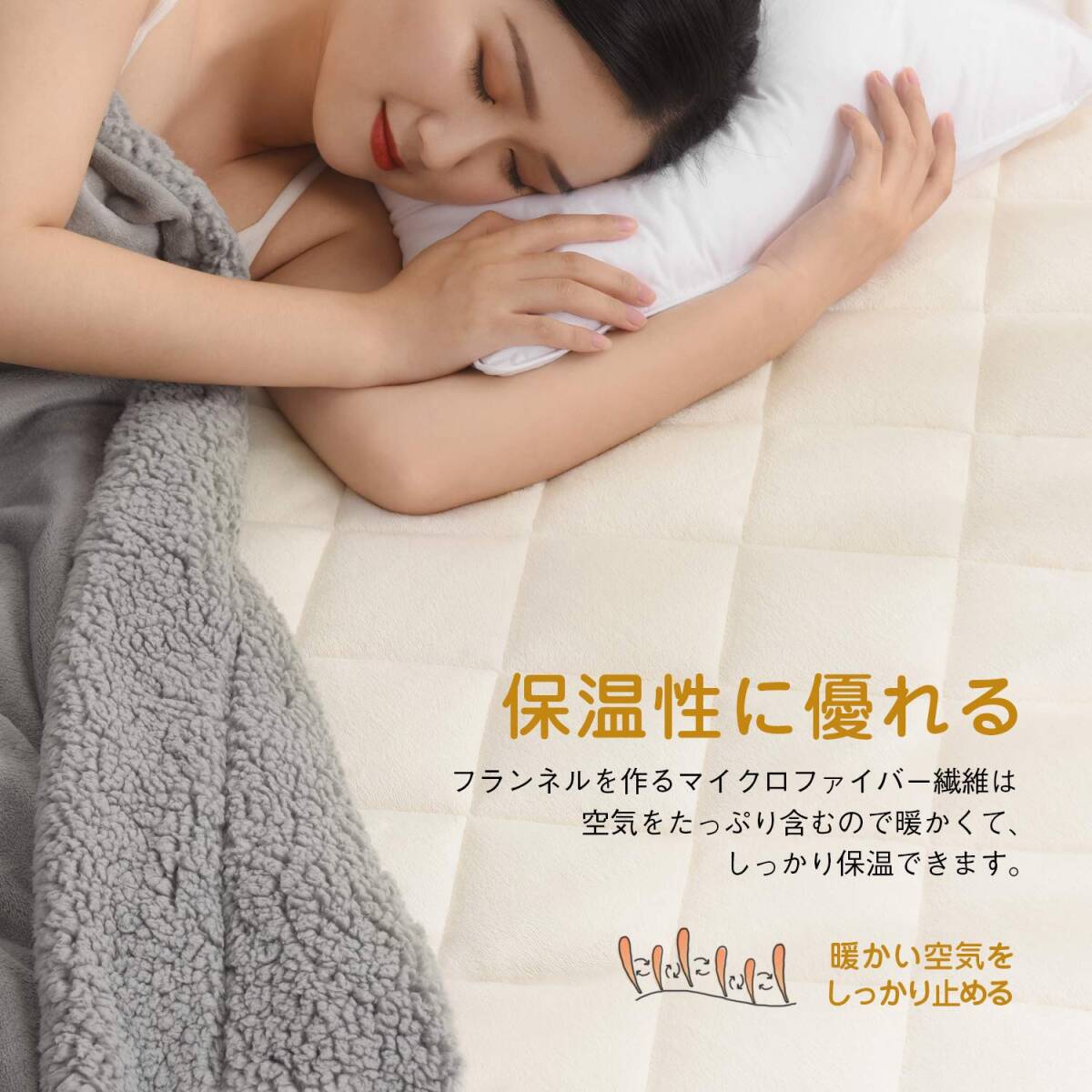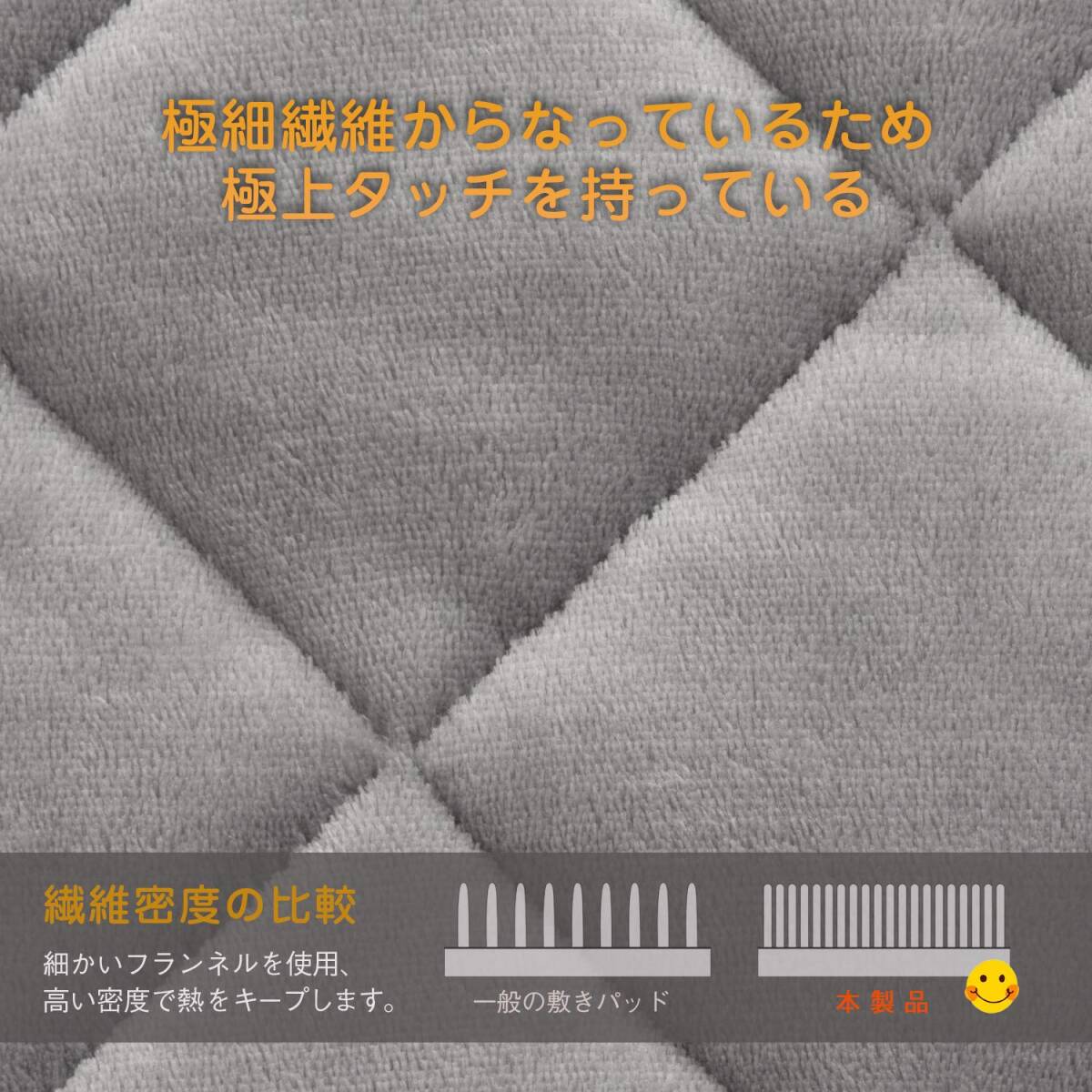 ・アップグレードした素材:毛羽部分は触れると暖かい、極上タッチのフランネルを敷きパッドにしました。フランネルは、きめ細かい毛並みとふんわりした触り心地が魅力です。やわらかくて暖かいため、寒い時期に欠かせない生地の一つです。充填にはクッション性と保温性に優れた中綿を使用し、よい寝心地を実現しました。