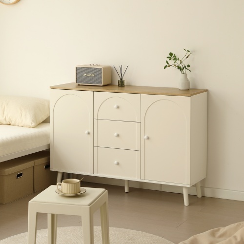 使いやすさとおしゃれを両立するサイドボード,隠したい物を収納、上品な外観を崩しません、オーペンスペースにはディスプレイしたい物あるいはよく使う物の置き場としても便利。コンパクトながらたっぷり収納でき、スペースを最大限に利用できます。【さまざまなシーンで活躍しますイドボード、間仕切りなどとして、またオフィスや玄関にも最適です。オープン収納スペースと引き出しを備え、使い勝手の良さと見た目の美しさを両立しました 。高さは83cmで、天板にディスプレイしても圧迫感を感じさせません。またお茶やコーヒーをいれる作業台としてもお使いいただけます。【キッチン収納として】奥行は35cmで電子レンジ、コーヒー器具など様々な物のまとめ収納を可能に【リビングサイドボードとして】収納とインテリアを両立、本や雑誌もサッと取り出せる【便利な引き出し付き】衣類や雑貨など入れたいアイテムに合わせてすっきり収納できます。開閉スムーズな金属レールは落下防止デザインで気持ちよく使っていただけます。【水やキズに強くメラミン加工】硬度が高く、傷がつきにくいです。また、耐熱性や耐汚染性、耐光性、耐薬品性などが備わっていて、表面柄が変化しにくいのでお手入れも楽です。【広々とした天板】天板は118*35cmと広々としており、耐荷重性に優れた天板なので、テレビや電子レンジ、大きなインテリア雑貨などを安心して置くことができます。【可動棚付き】棚板は三段調整可能、収納したい物の大きさに合わせて動かせます。【天然木脚付き】床との間にスペースがあるので、掃除機やモップが簡単に届き、清潔感のあるお部屋をキープ!【detail】上品なアーチデザイン、横揺れ防止用具付き、コード穴付き、配線もすっきり
