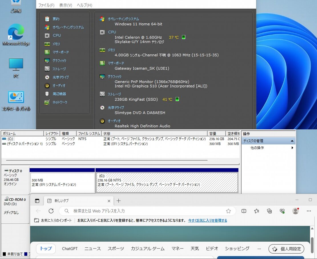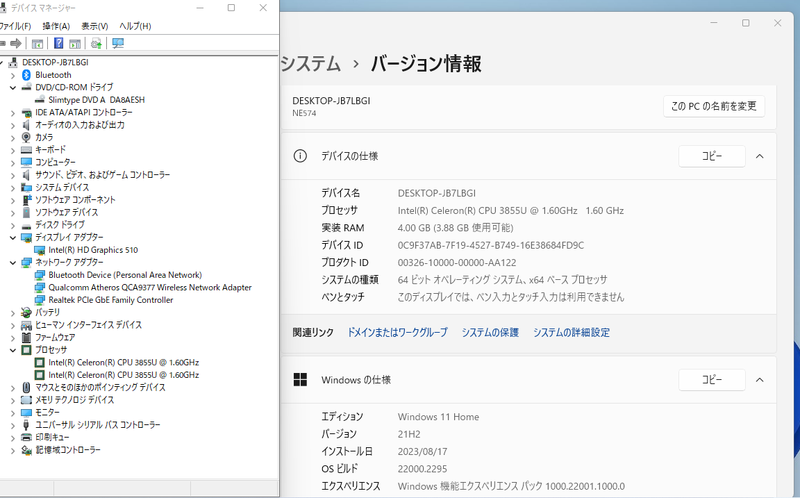 CPU | Intel Celeron プロセッサー 3855U 2M キャッシュ、1.60 GHz |