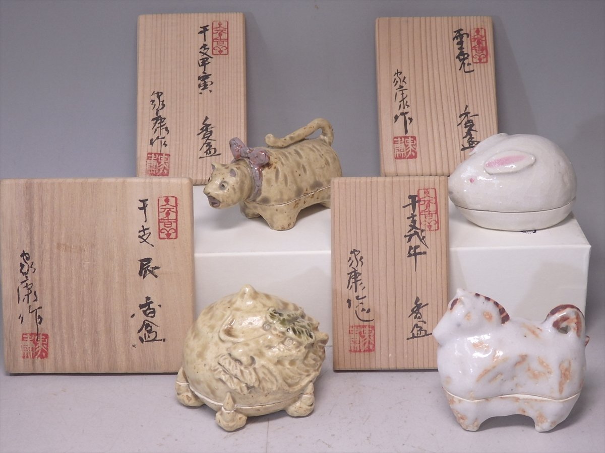 ★状態良好!黄瀬戸ほか【水野家康作 干支香合4個 共箱】寅 卯 辰 午 雪うさぎ:6×4×高さ4cm 茶道具 置物 茶器