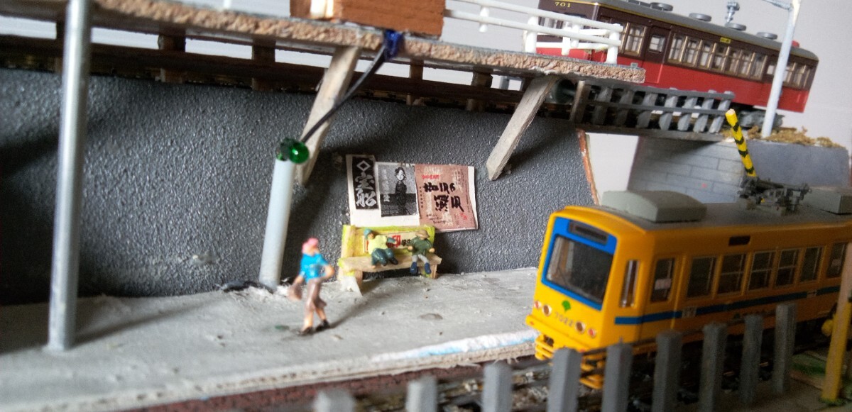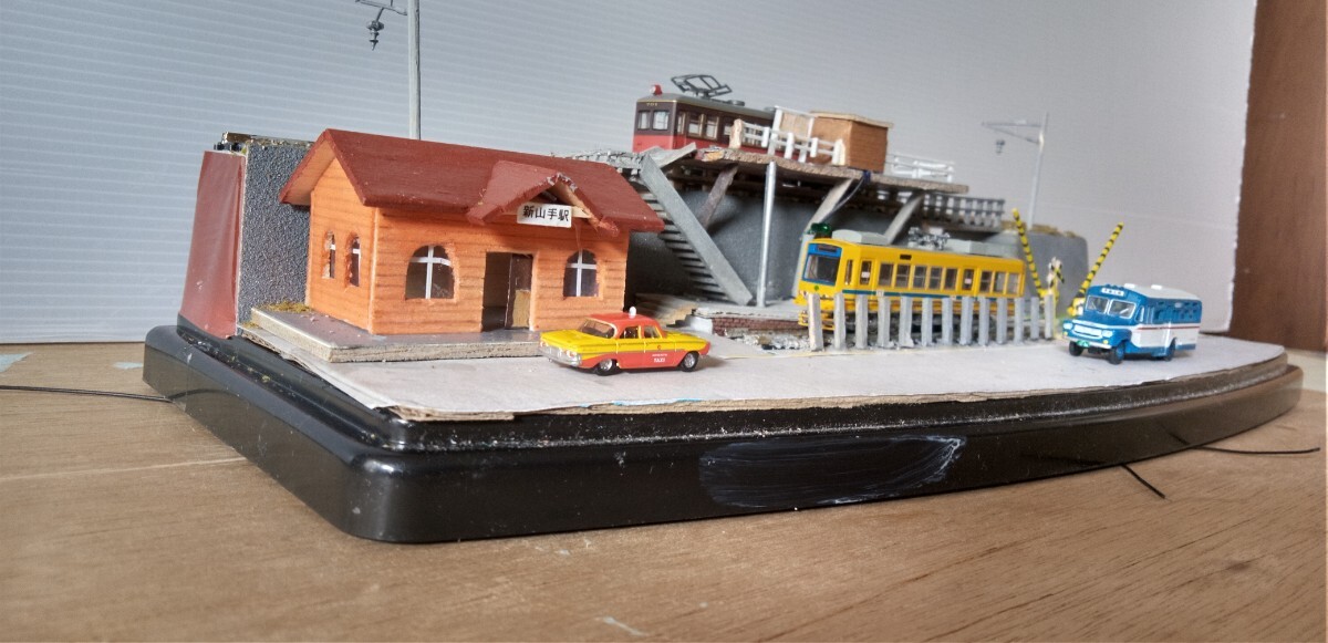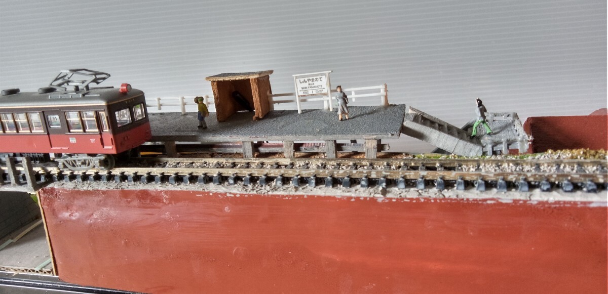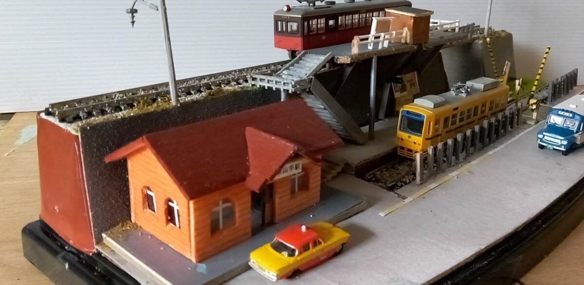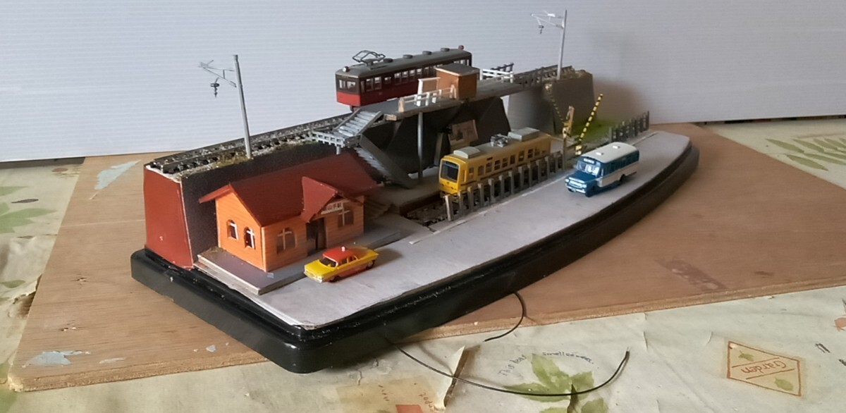 駅舎他全て手作りです。(駅舎、ホ―ムに電飾設置)数人の乗客を付けました。