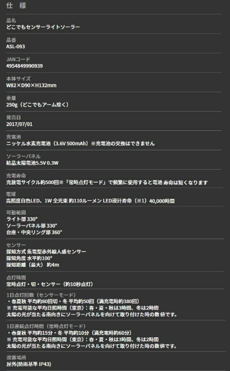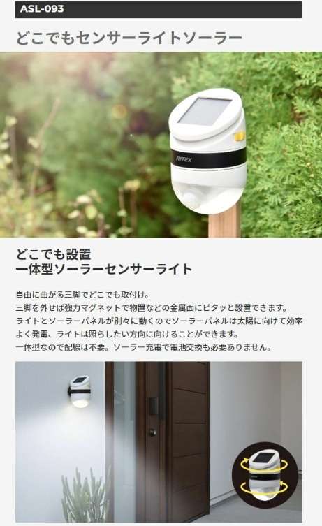LEDどこでもセンサーライト ソーラー ASL-093 ライテックス