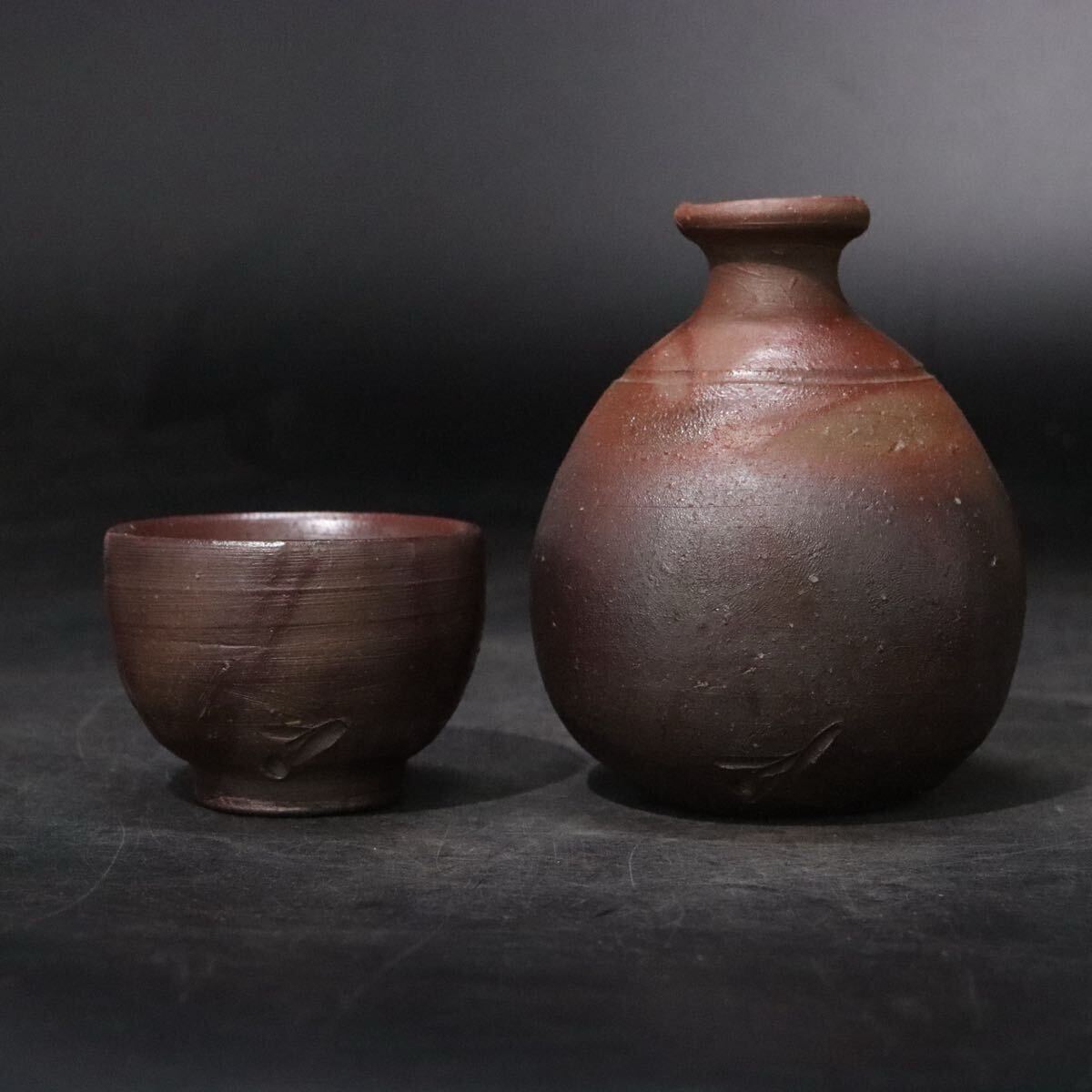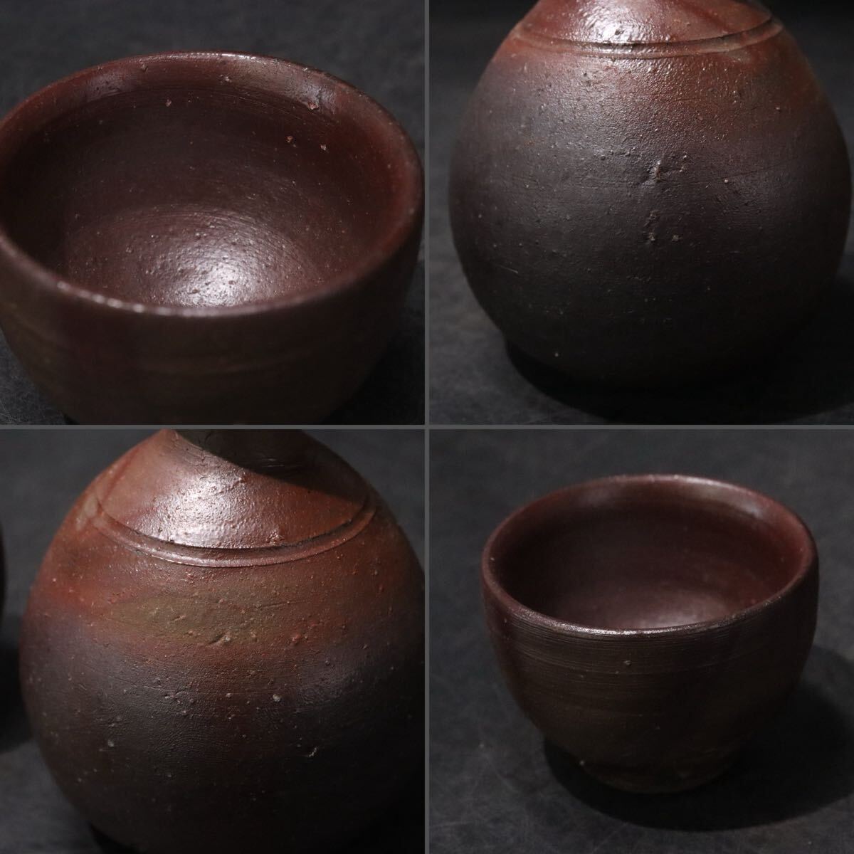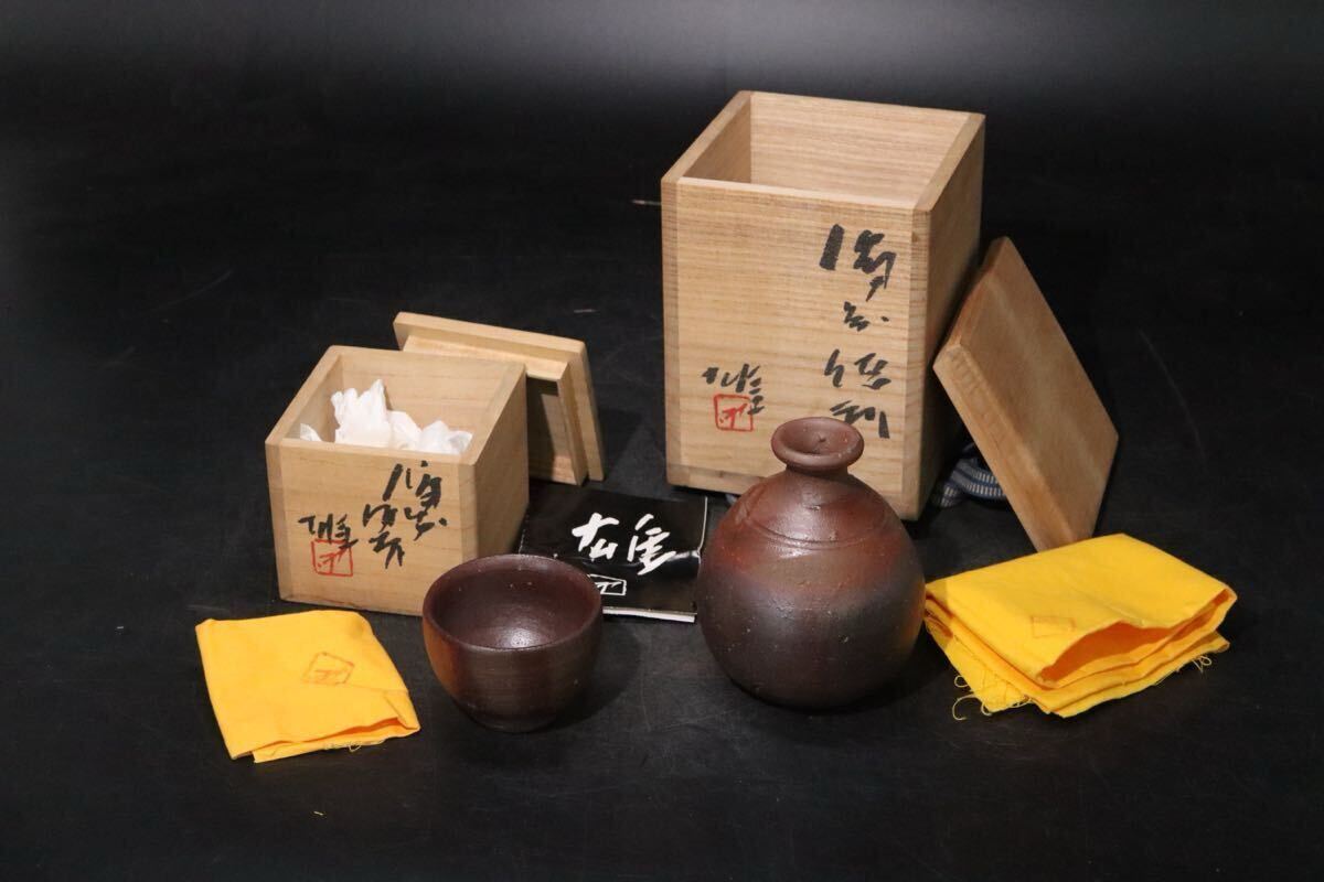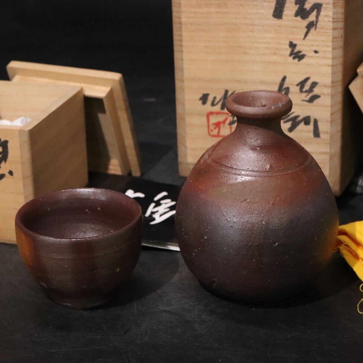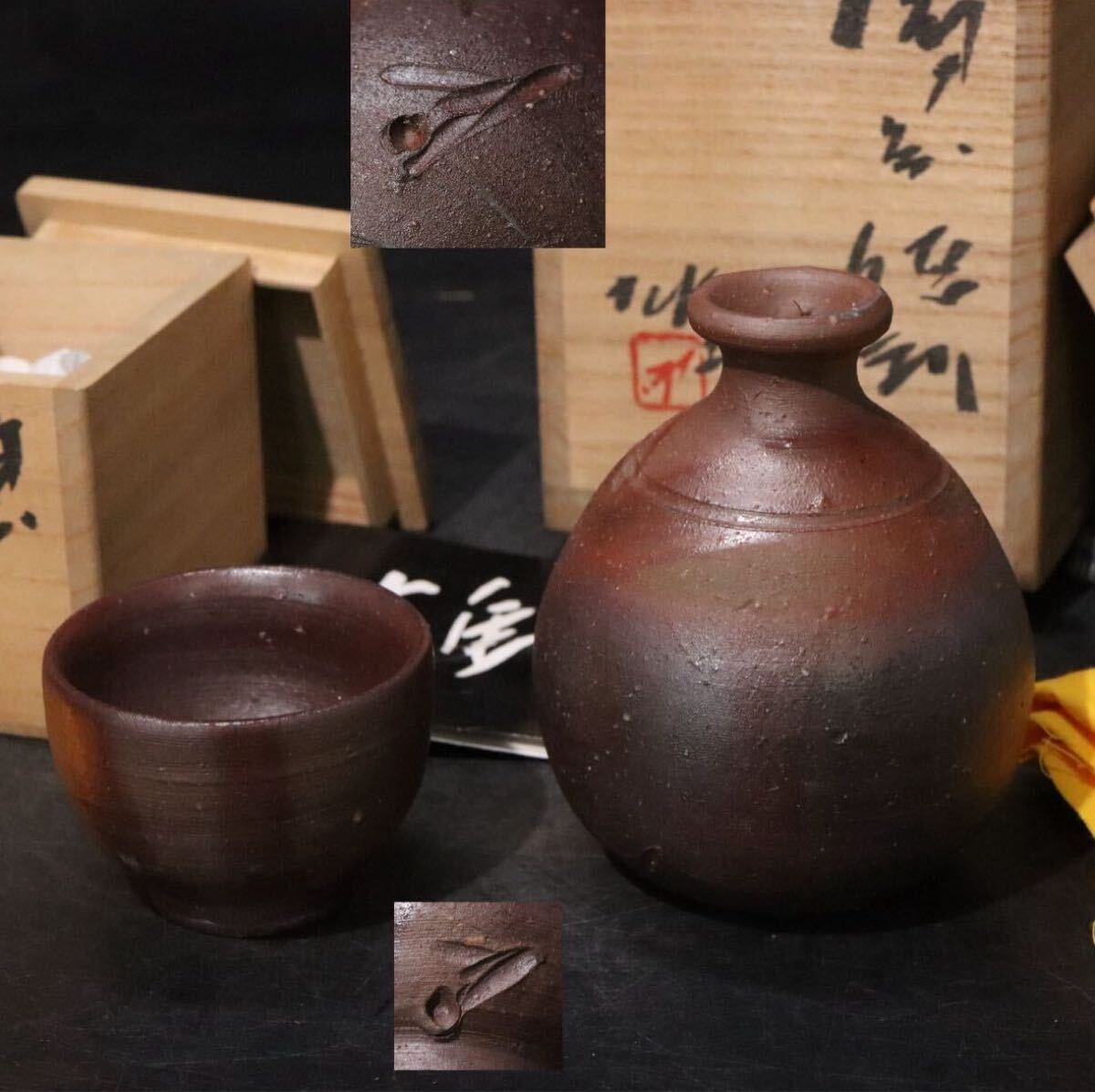 | 藤原雄 作 備前 酒器セット 「 徳利 ・ ぐい呑み 」 各 共箱・共布 / 備前焼 人間国宝 煎茶碗 手造 手捻り .B1307 |