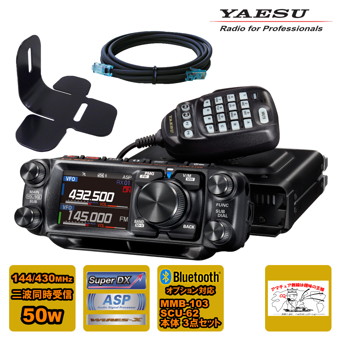 FTM-510D ASP 50w 本体にオプションの MMB-103 ダッシュマウントブラケット 更に SCU-62 コントロールヘッド延長ケーブル3mをセットにした3点セット商品です。