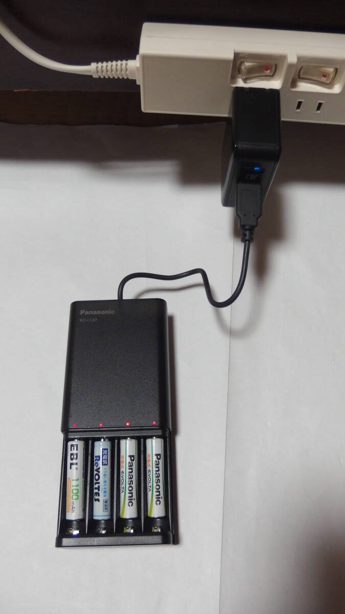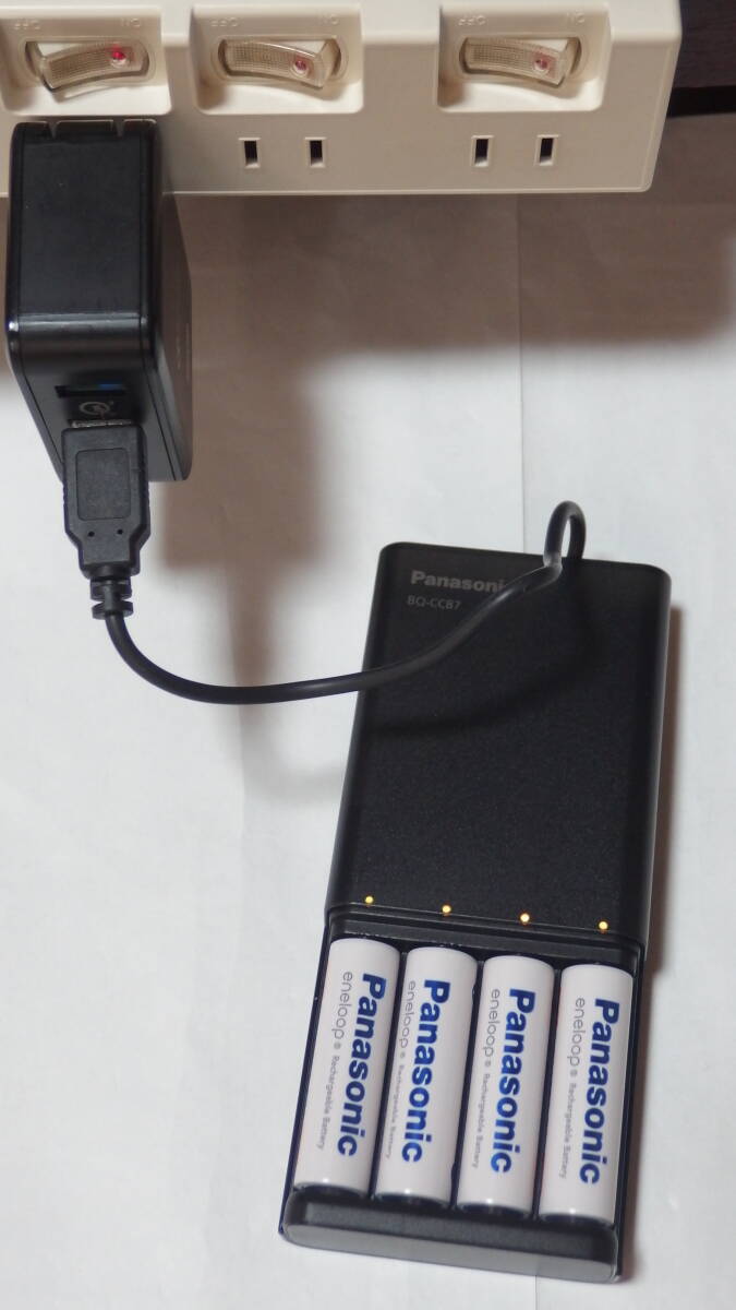 ・単4型  Ni-MH充電池 eneloop等を4本、 BQ-CC87Lにセットし、microUSBにACアダプターを接続した。