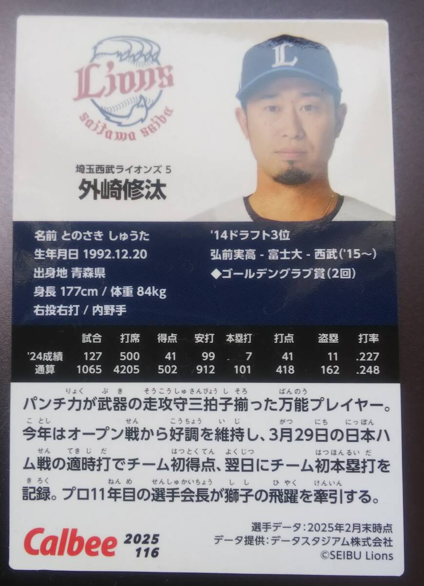 カルビー プロ野球チップス 2025 第2弾 レギュラーカード 116 埼玉西武ライオンズ 外崎修汰