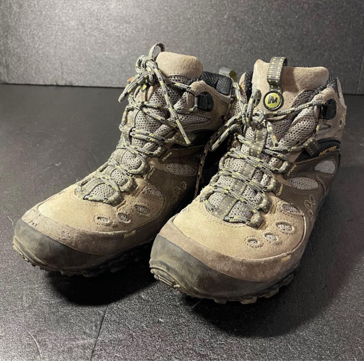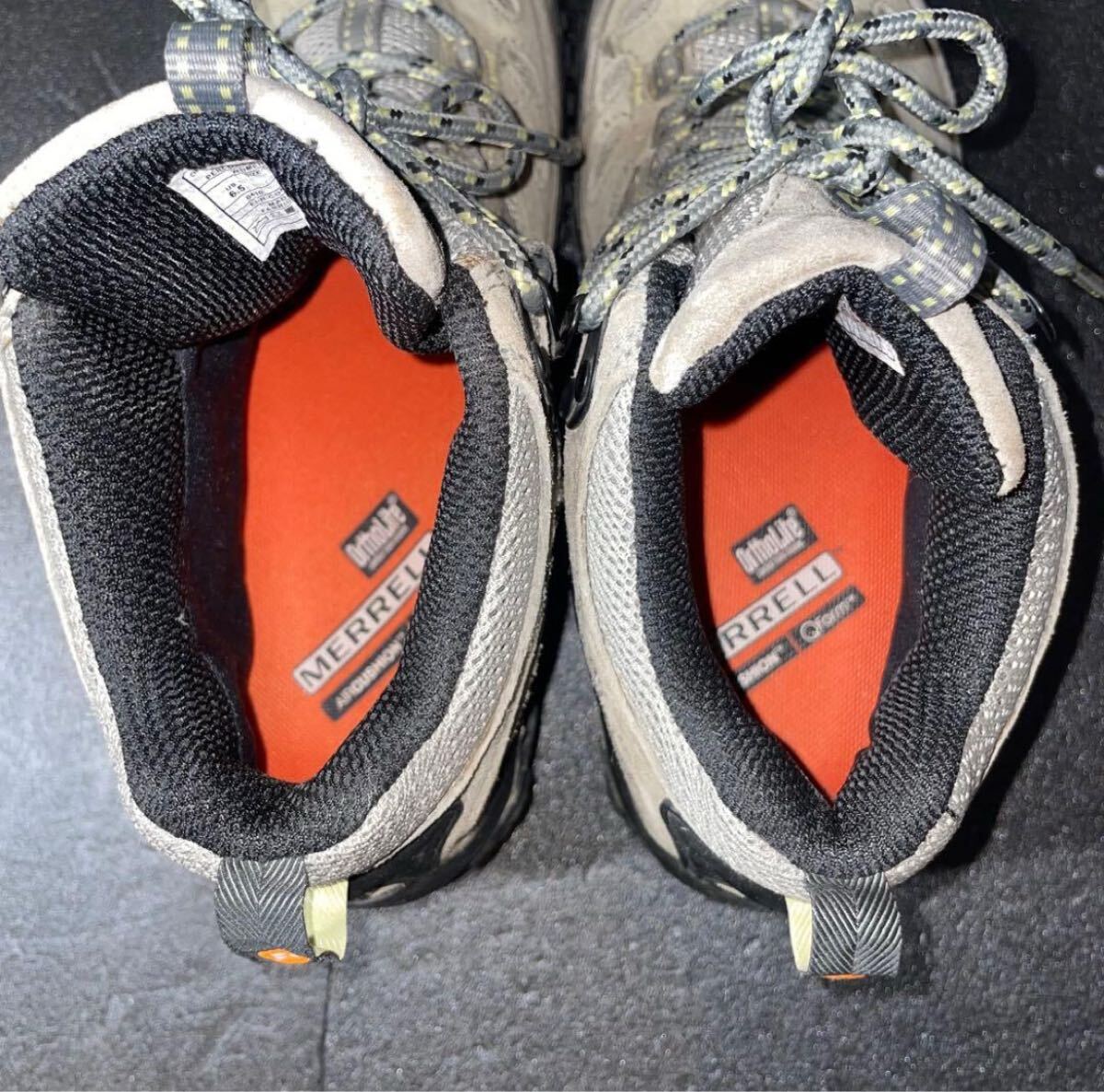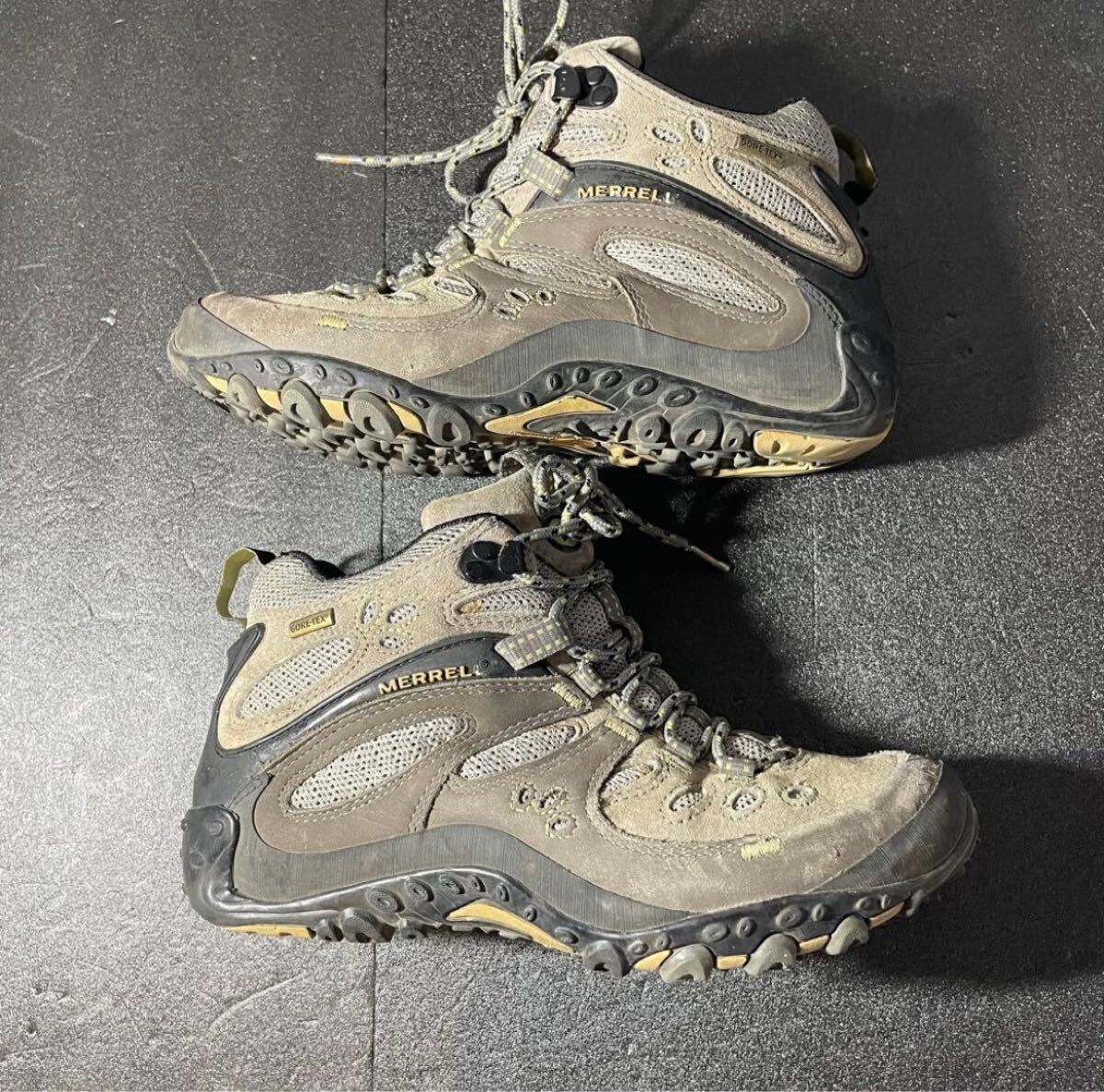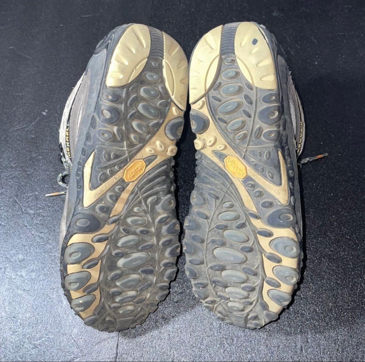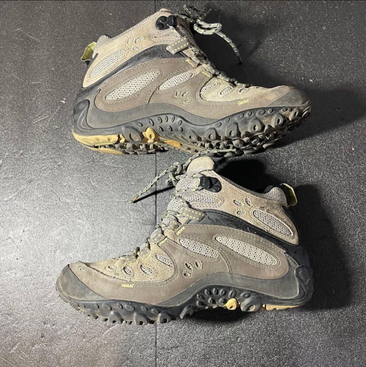 レザーとメッシュのハイカット登山靴、vibramソールで耐久性抜群。