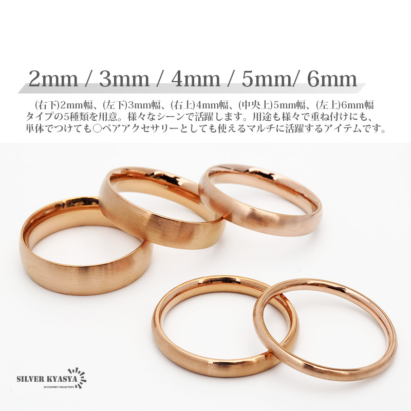 装飾のないプレーンな甲丸リングに大人のお洒落を楽しめるローズゴールドカラーが登場。つや消し加工の上品な輝きとシンプルなデザインは様々なシーンで活躍間違い無しのアイテム。ペアリングとしてもおすすめです。