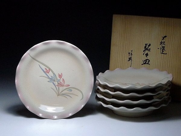 80HT174★萩焼 椿秀窯 波縁花文銘々皿 五客揃 5客揃 共箱 和食器 日本料理 割烹