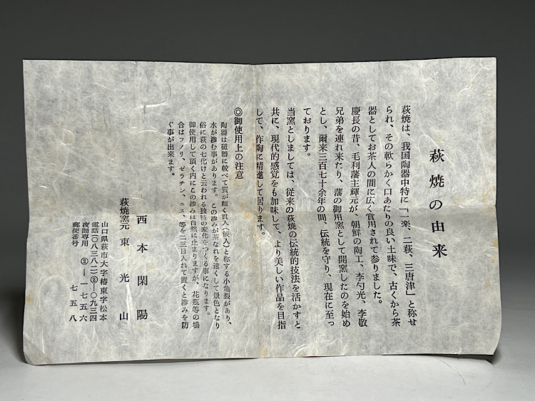 西本閑陽 東光山 萩焼茶碗 共箱 共布 栞 ◆商品詳細 寸法(約):7.8x11.8x10.6(高×幅×口径cm) ※寸法に若干の誤差が生じる場合もございます。 少し汚れがありますので、 ご承知の上入札お願いします。 状態等画像にてご確認の上ご入札よろしくお願いいたします。 ◆発送先等のご連絡とお支払いについて ※発送先等のご連絡 落札時から48時間以内にお願い致します。 ※お支払 かんたん決済の期限内にお願い致します。 複数点落札時にまとめて取引の場合(72時間内)に、 まとめて取引の取引手順(落札者方の操作)を参考にお願い致します。 梱包したサイズを測って、地方によって送料を決めますので、よろしくお願いします。 ◆掲載画像について ※画像は現物を撮影しておりますが、照度、遮光、モニターによっては実物と 色目が異なって見えることがありますのでご注意ください。掲載画像では確認 できない傷や汚れがある可能性もございます、あくまで 中古品であるということをご承知の上、御入札をお願い致します。 ◆補償について 商品到着後はすぐに状態の確認をお願い致します。 商品の破損等がございまし たら、箱や梱包材など全てそのままの状態で保存し、お早めにご連絡ください。 (到着日から一週間以上経過、梱包材の廃棄済み等の場合、保証は致しかねます のでご注意ください。) ◆返品について 思っていたイメージと違う、などのお客様主観による返品はお受けできません ので、予めご了承ください。ノークレーム、ノーリターンでお願いします。届 いた商品が商品説明と著しく異なる場合(寸法、キズ記載ミスなど)のみ承り ます。早めにご連絡ください。 ◆注意事項 当方の希望価格と隔たりがある場合は、終了前にやむなく取下げさせて頂く場 合がございます。 ※商品ご落札翌日から4日間以内にご連絡が取れない場合は、入札取消の処置を 取らさせていただく場合がございます。 ※評価の悪い方は取り消す場合がございます。 ※原則として当方の不備以外のキャンセル・返品・返金は受け付けておりません。 以上の点を予めご了承頂いた上で、入札・落札お願い致します。 ◆発送方法 ▼ゆうパック(補償あり/追跡あり) 梱包後のサイズ:~約60cm ※送料全国一律880円 (但し北海道、沖縄、離島は+500円いただきます。) 発送元は静岡県となります。 ( 商品の組み合わせによっては同梱をお断りさせていただく場合があります。) ※大型商品について 郵便局の規定を超える商品の場合は、佐川急便またはヤマトでの発送となります。 |