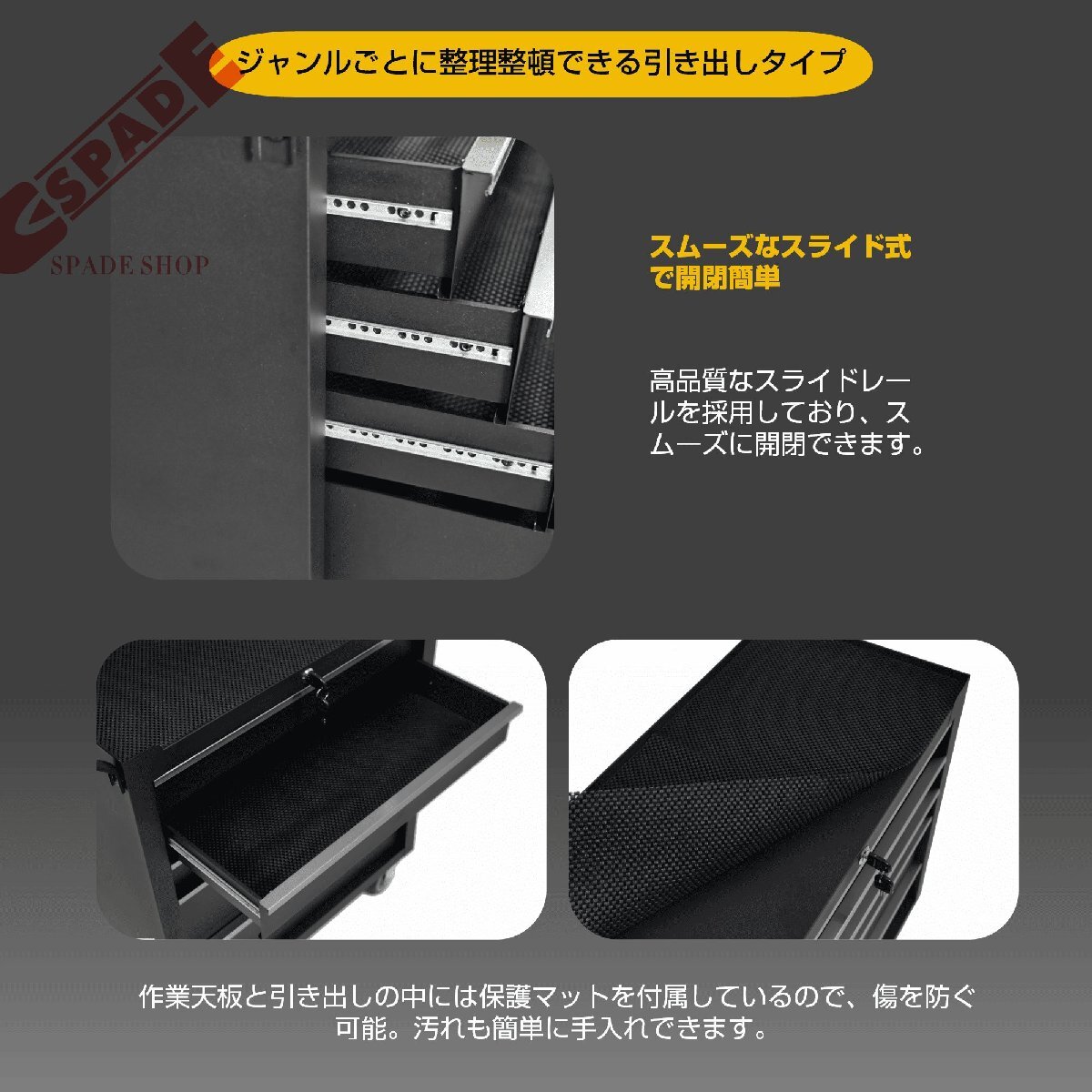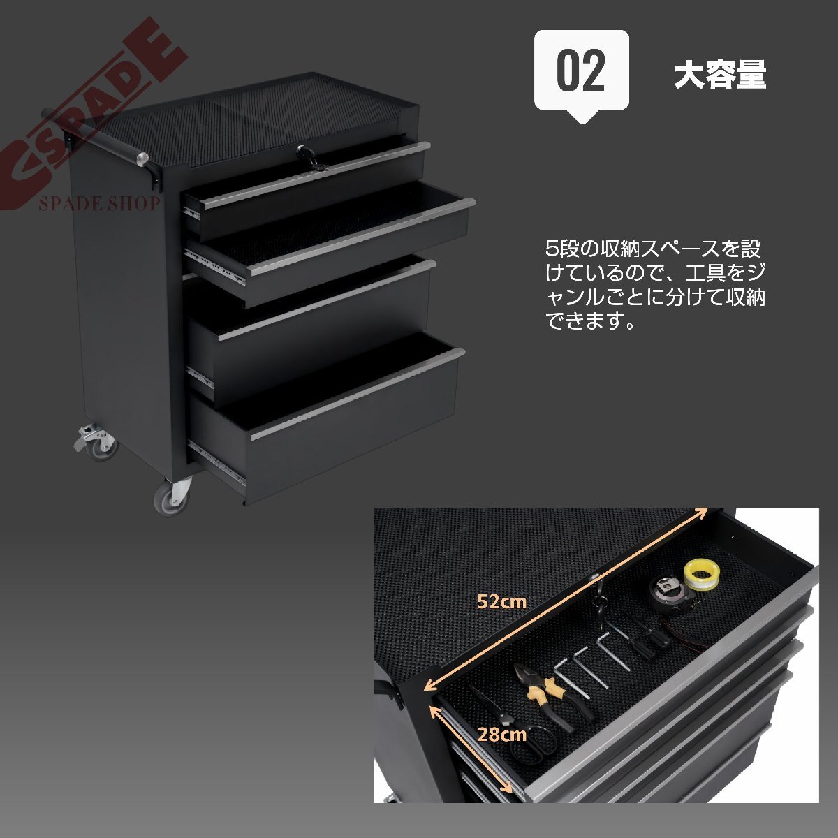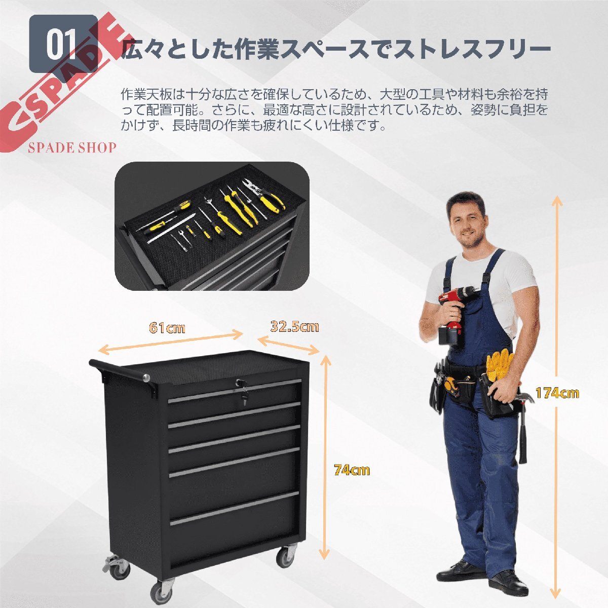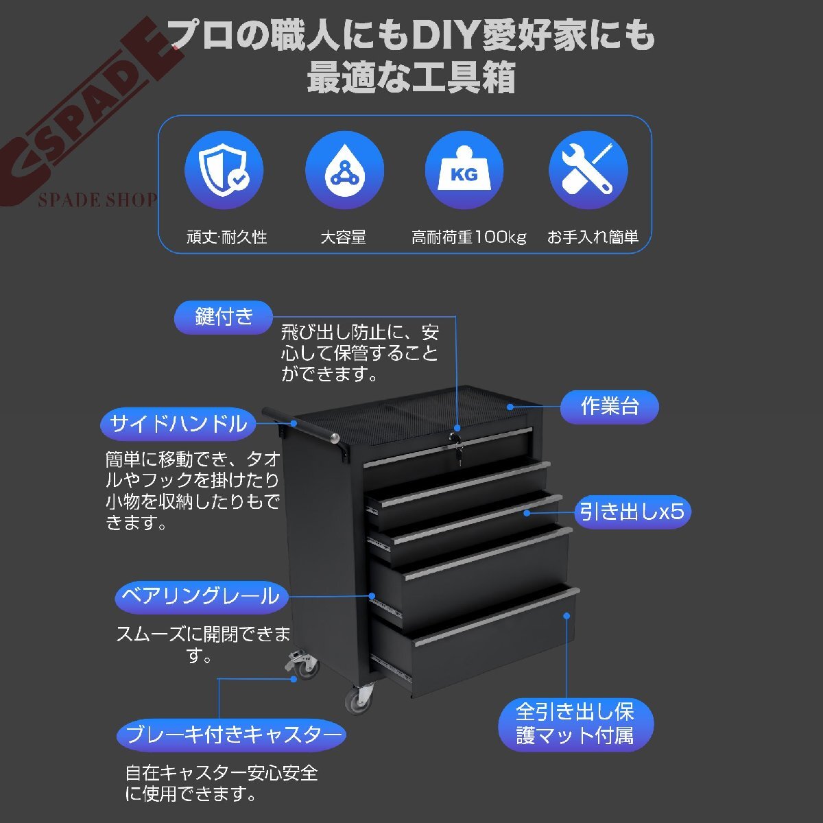 • 【大容量】5段の収納スペースを設けているので、工具をジャンルごとに分けて収納できます。ジャンルごとに整理整頓できる引き出しタイプ スムーズなスライド式で開閉簡単 高品質なスライドレールを採用しており、スムーズに開閉できます。作業天板と引き出しの中には保護マットを付属しているので、傷を防ぐ可能。汚れも簡単に手入れできます。