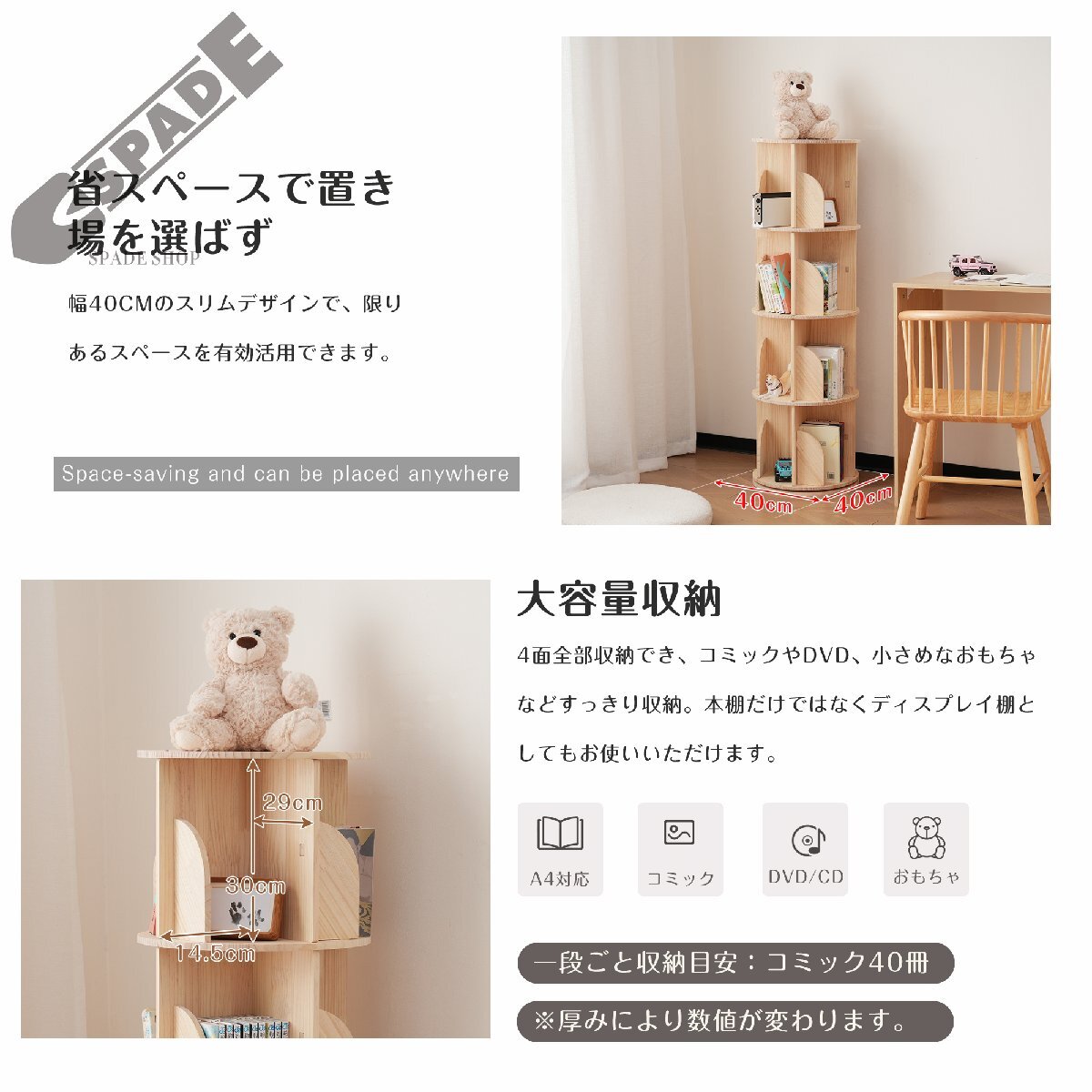 • 【大容量収納】4面全部収納でき、コミックやDVD、小さめなおもちゃなど全部収納。本棚だけではなくディスプレイ棚としてもお使いいただけます。