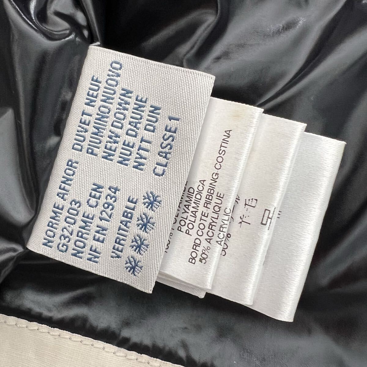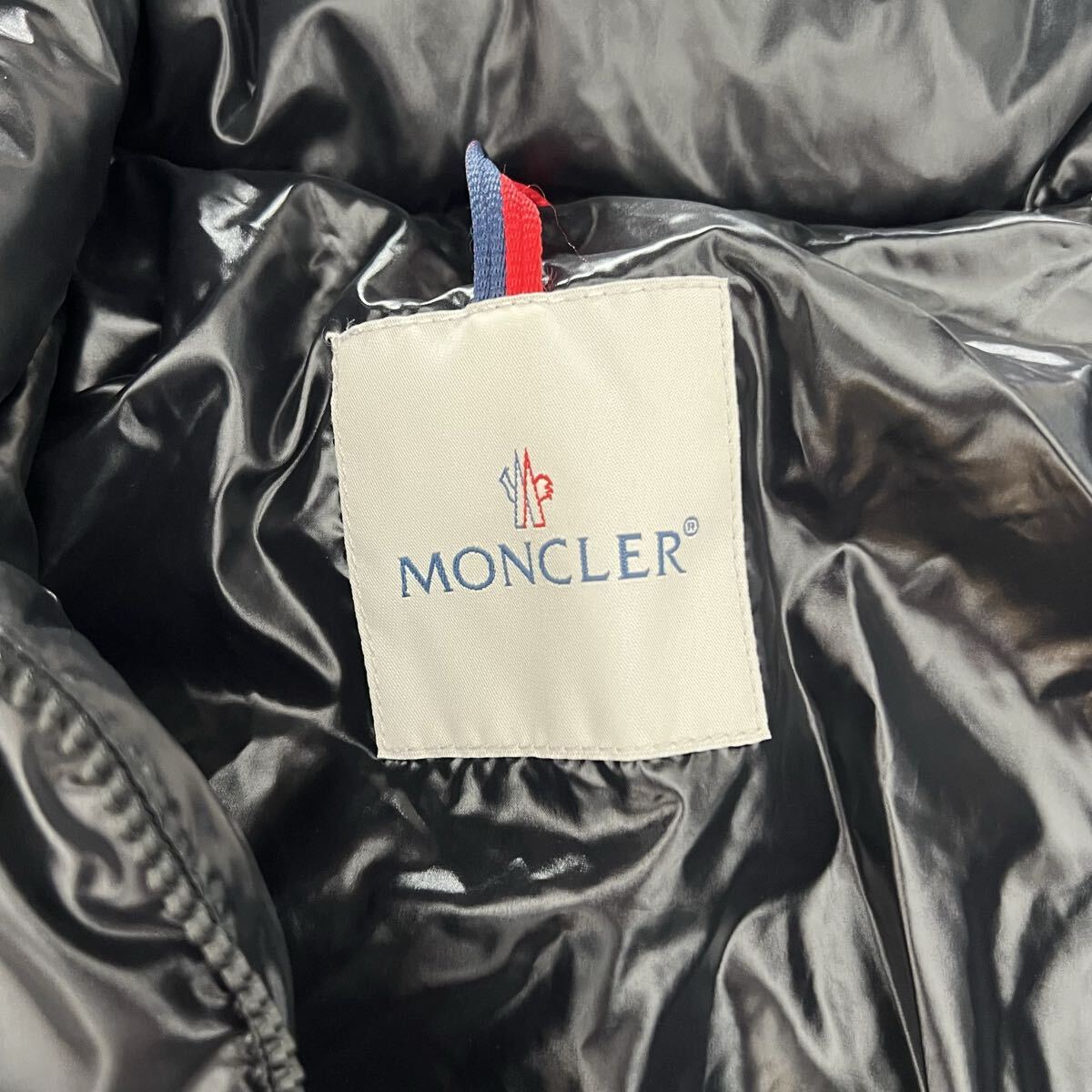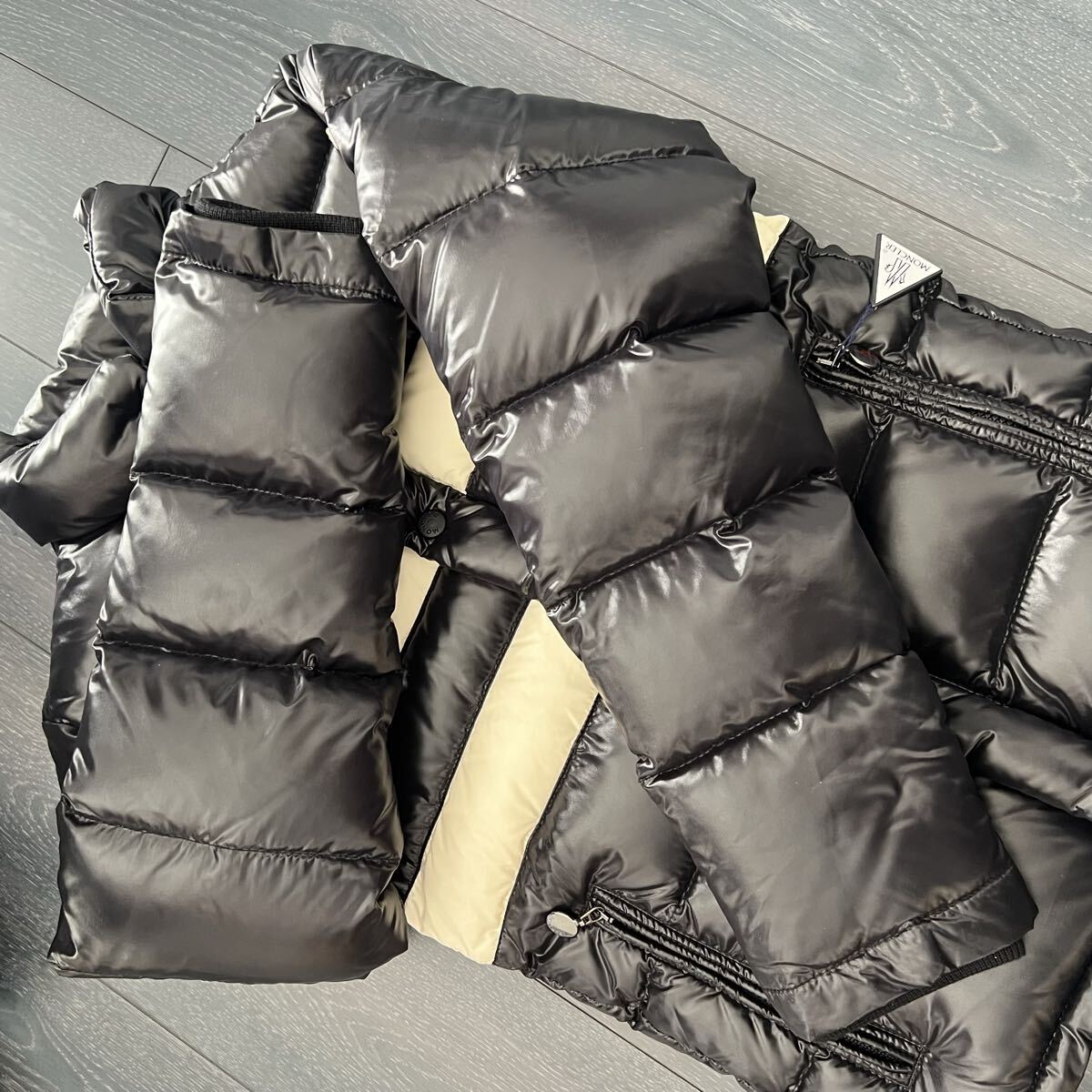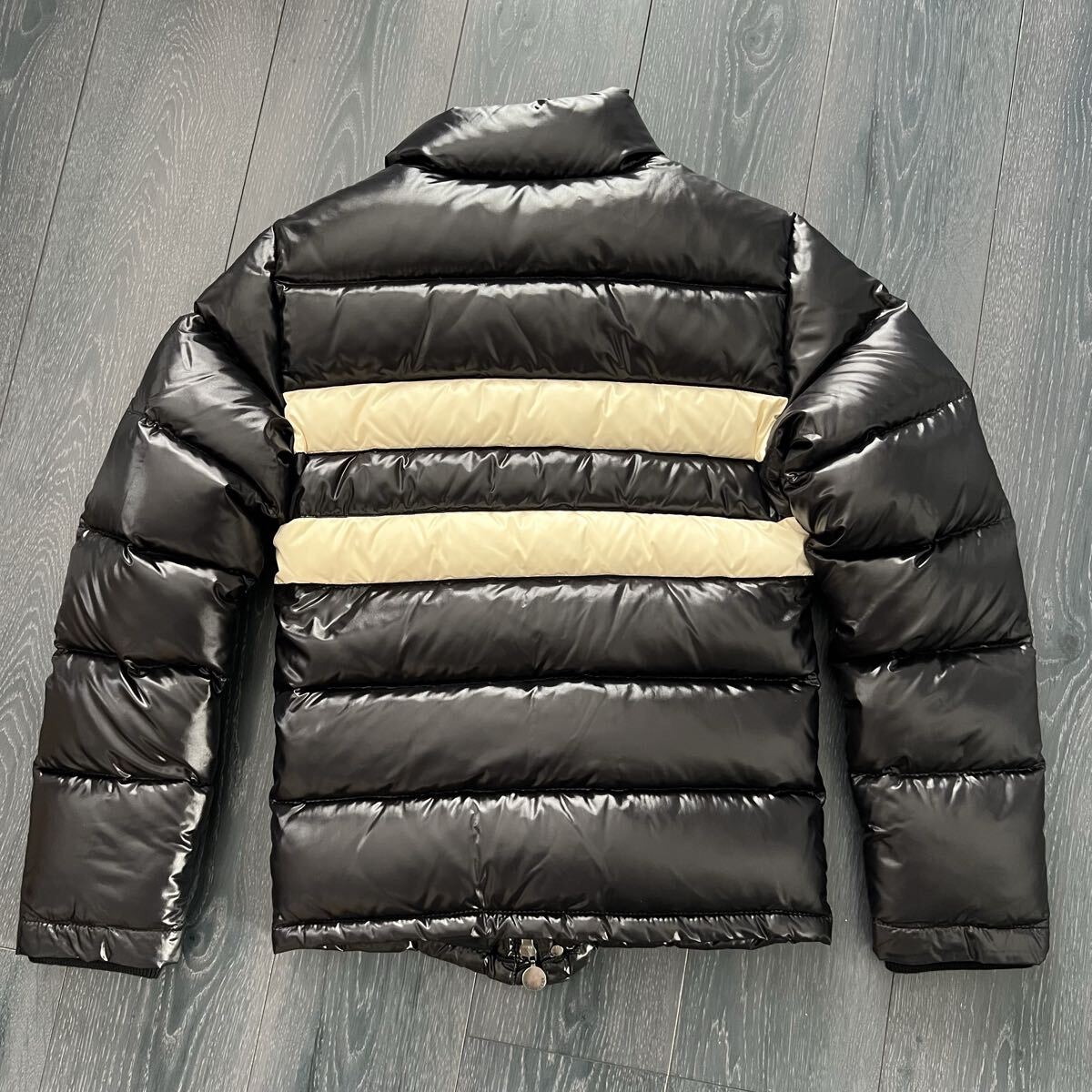 MONCLERのブラックとベージュのダウンジャケット、フロントボタンとポケット付きで機能的。