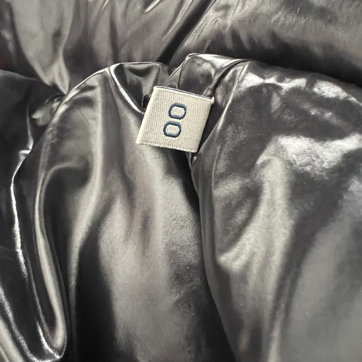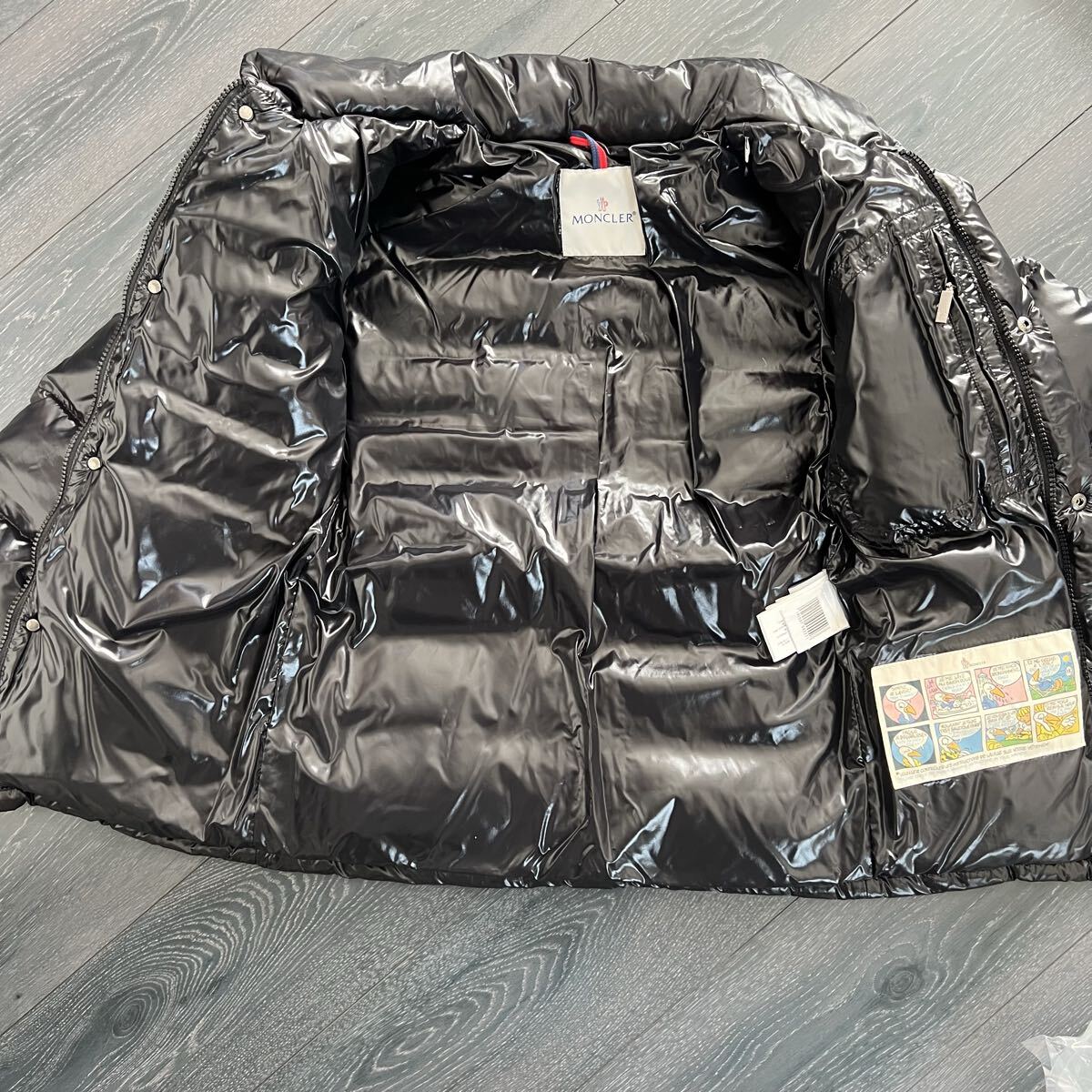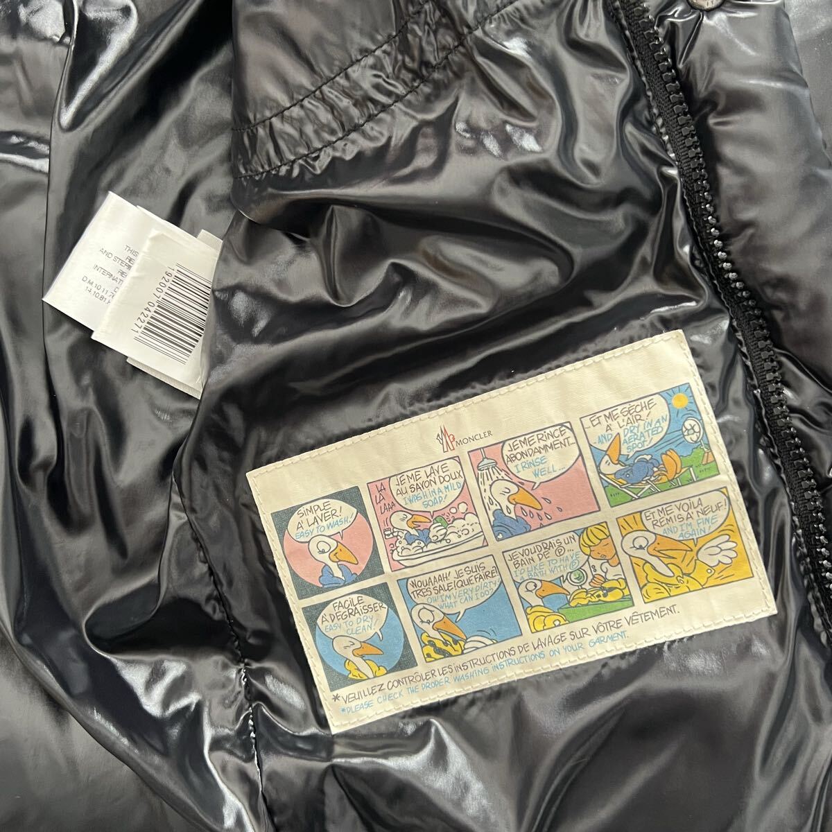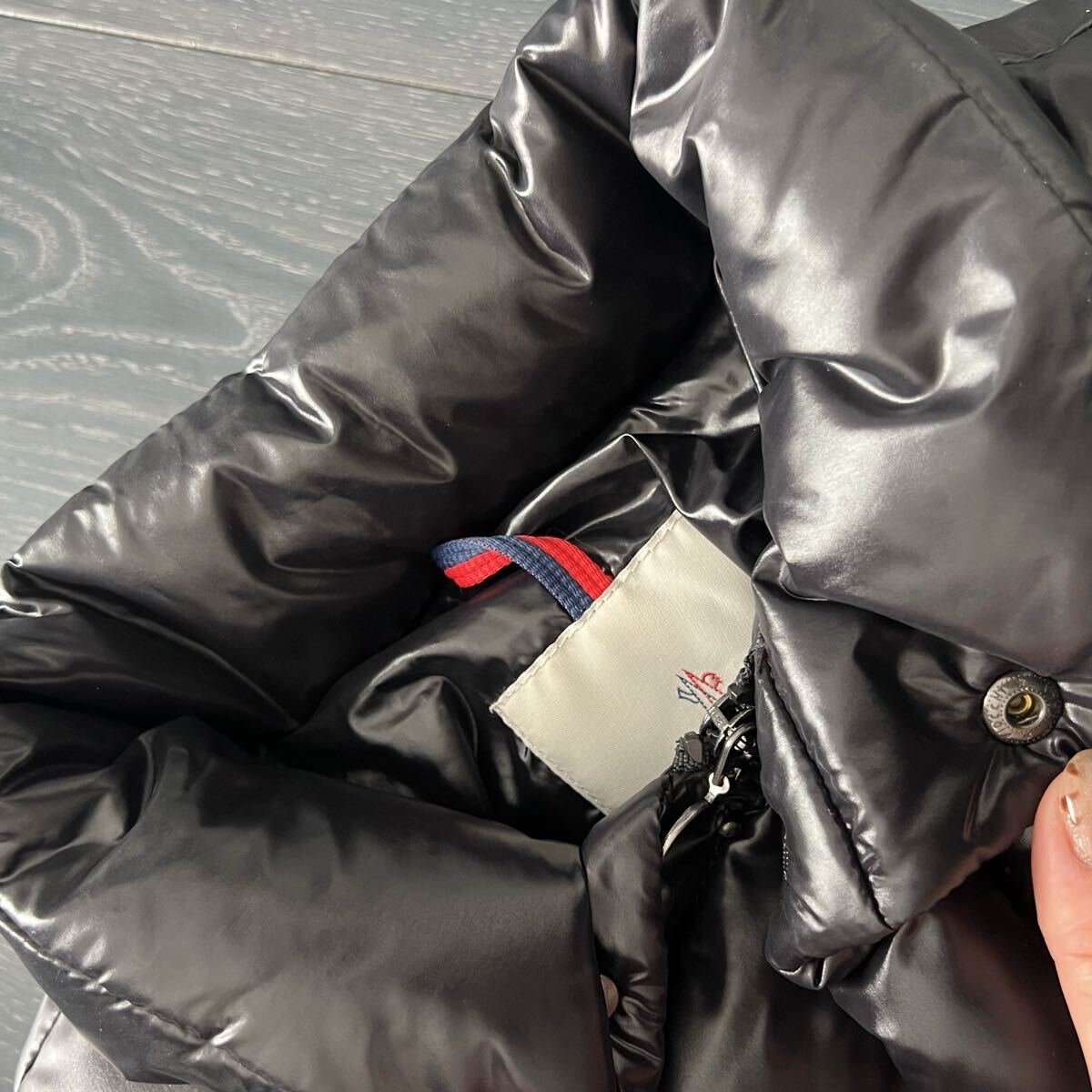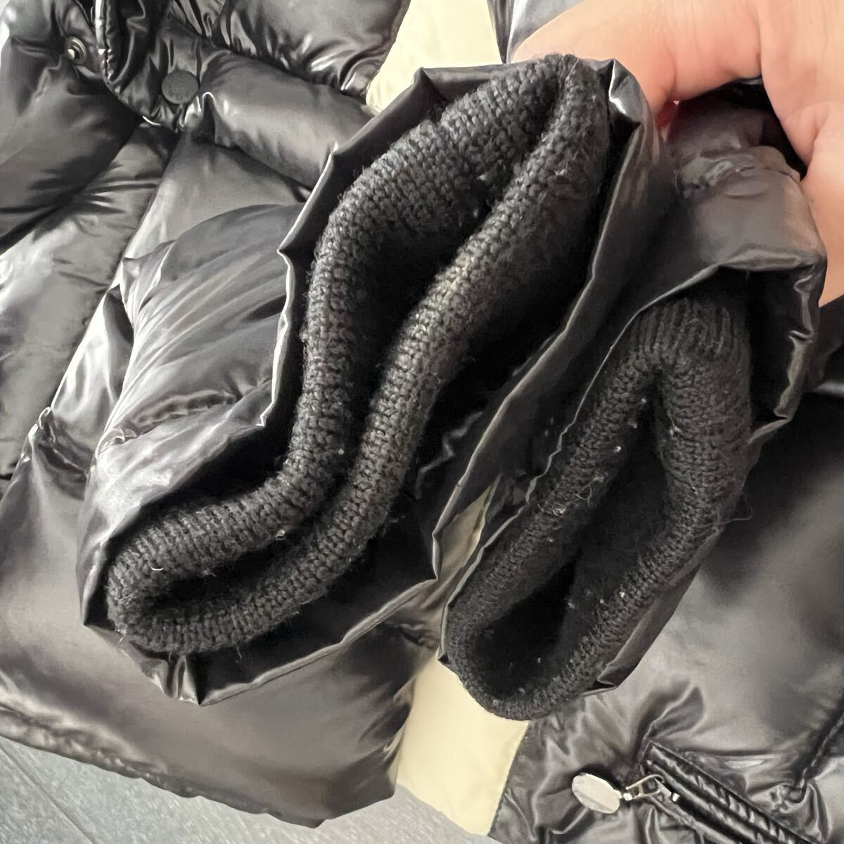 MONCLERのブラックとベージュのダウンジャケット、フロントボタンとポケット付きで機能的。