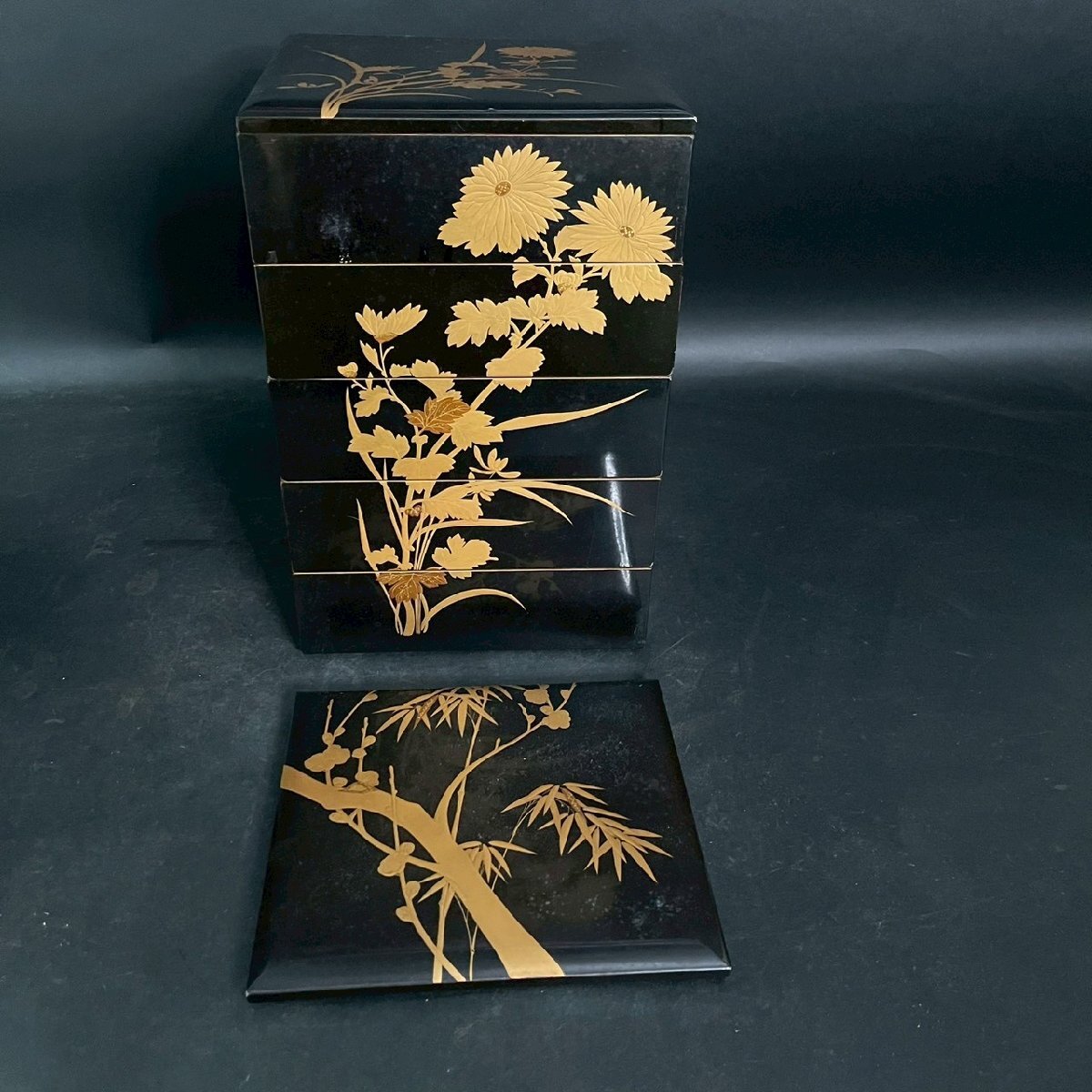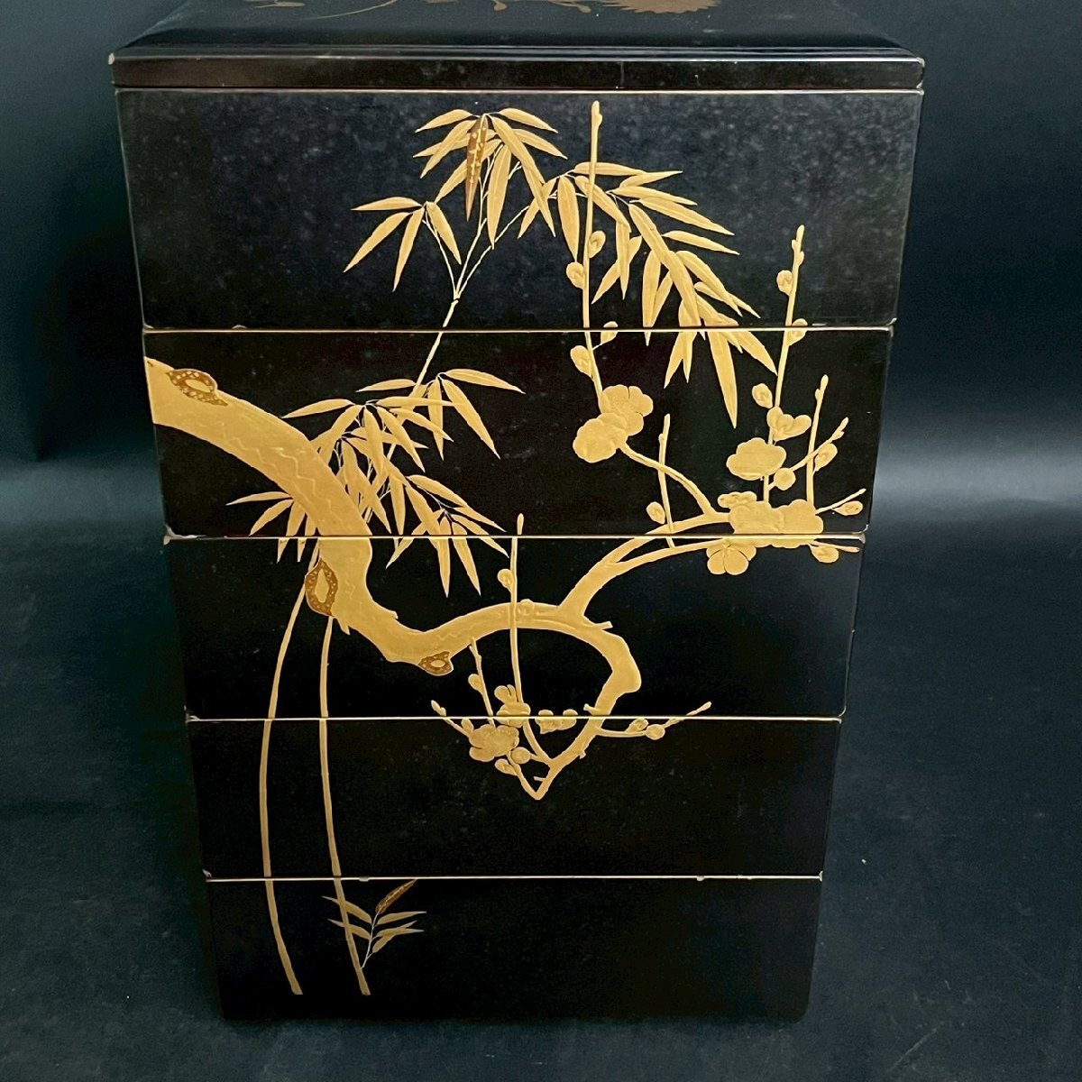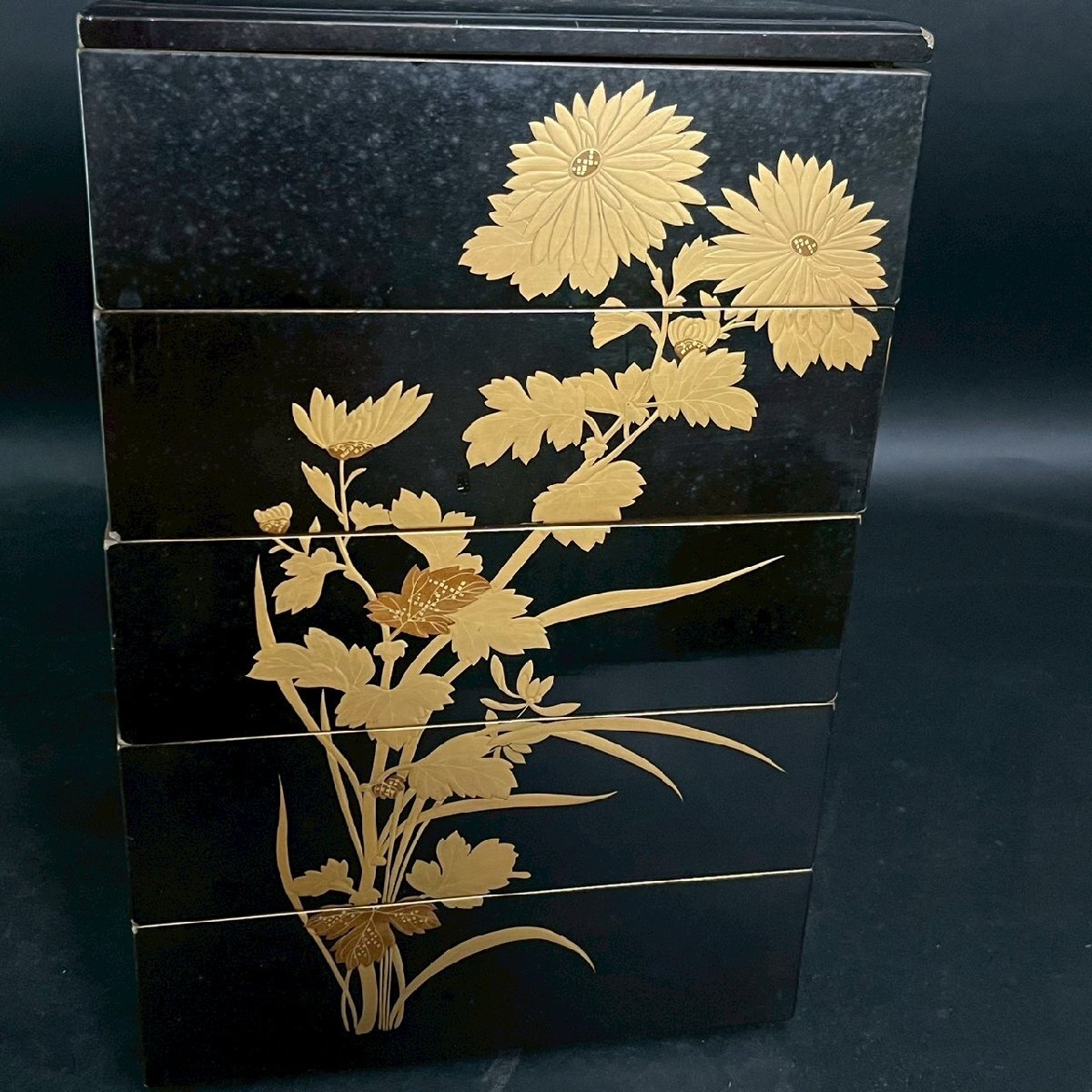 CV1017-52-7-3 重箱 箱 お弁当 会席 料理 蒔絵 金彩 花 古道具 漆器 漆芸 木箱 棚 伝統 工芸 高さ7.3㎝ 21.8×23.3㎝ 140サイズ