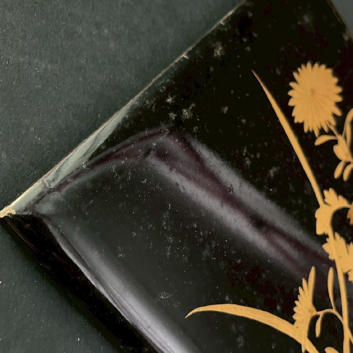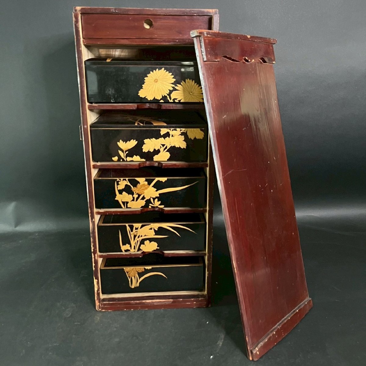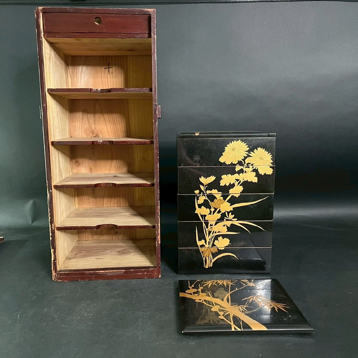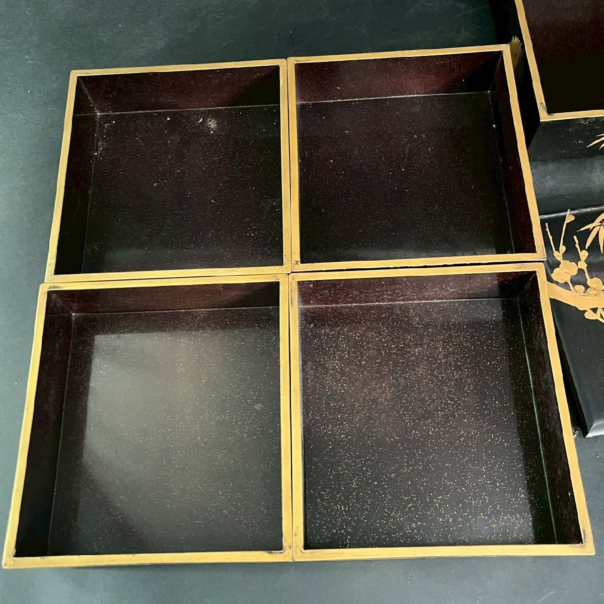 CV1017-52-7-3 重箱 箱 お弁当 会席 料理 蒔絵 金彩 花 古道具 漆器 漆芸 木箱 棚 伝統 工芸 高さ7.3㎝ 21.8×23.3㎝ 140サイズ