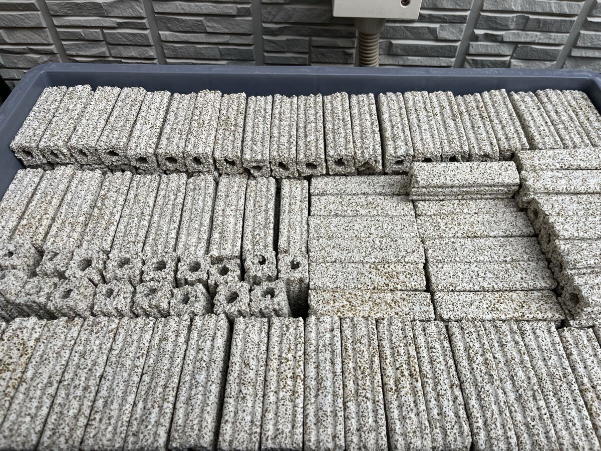 四角棒状で、スペースの無駄がなく、レイアウトがしやすいです。外周の窪は、ろ材同士を並べたときに、空洞となり、密集配置しても通水性の確保ができる作りになっています。中央に大きな穴が空いているので目詰まりしにくい設計になっています。
