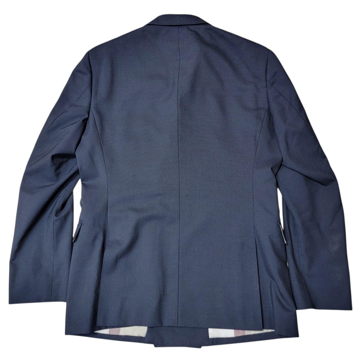 シルバーメタルボタン: フロントと袖口にあしらわれたクールなシルバーメタルボタンが、ネイビーの生地にシャープなアクセントを添え、品格を引き立てます。