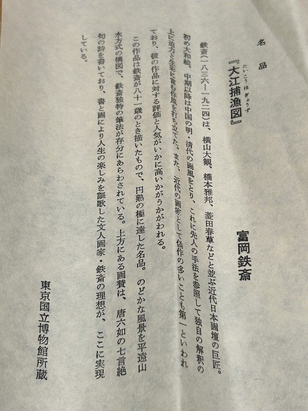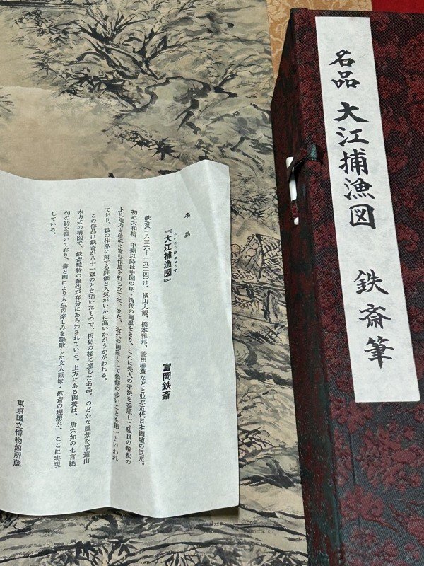 「名品 大江捕漁図 鉄斎筆」と記された表装箱と、解説書が付属しております。