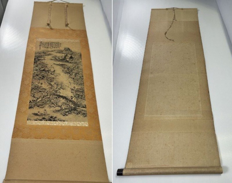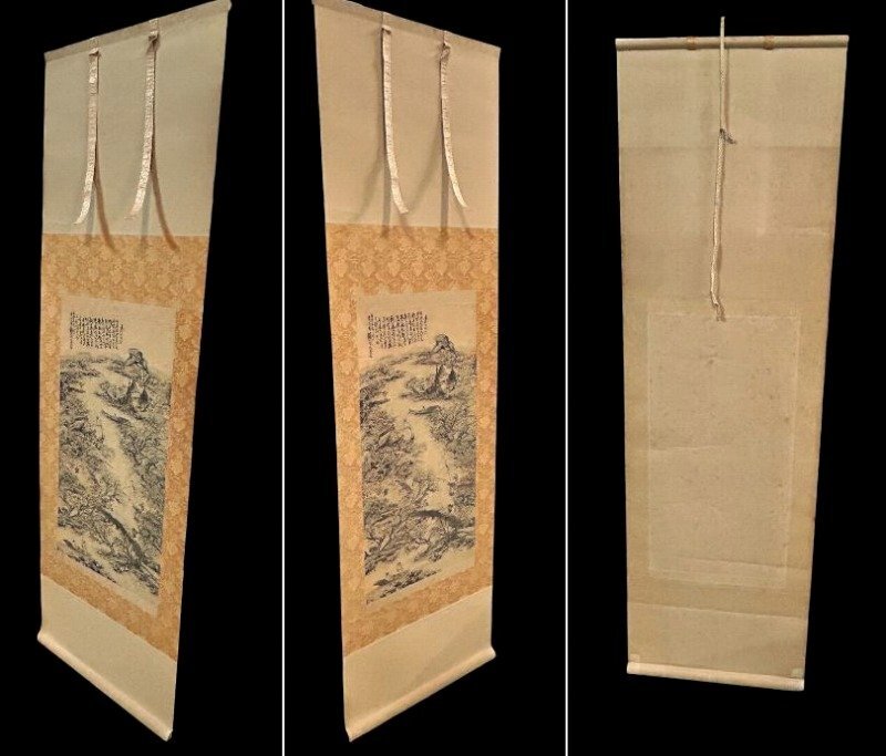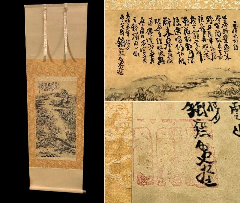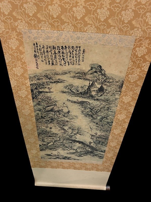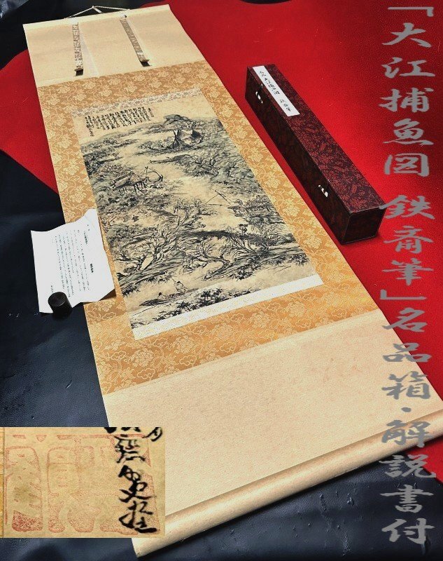 ◇鑑賞・研究資料【「大江捕魚図 鉄斎筆」名品箱・解説書付(真贋不詳)】唐寅「詠漁家楽詩」に寄せて ≪長さ139cm 巾42cm≫ Q05378