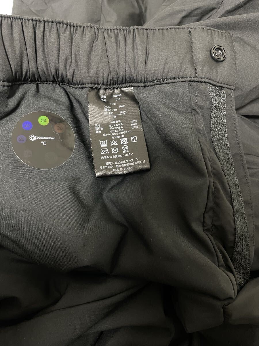 前後2つずつのポケットと前開きはジップ開閉、ウエストは紐が入っています。