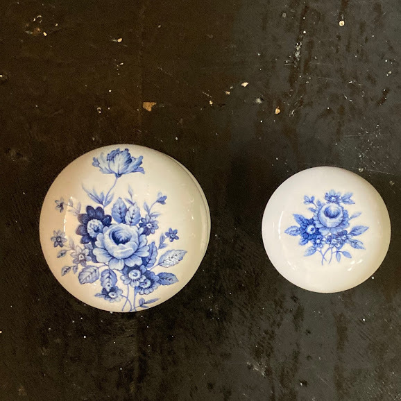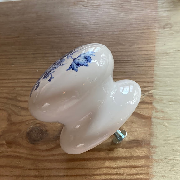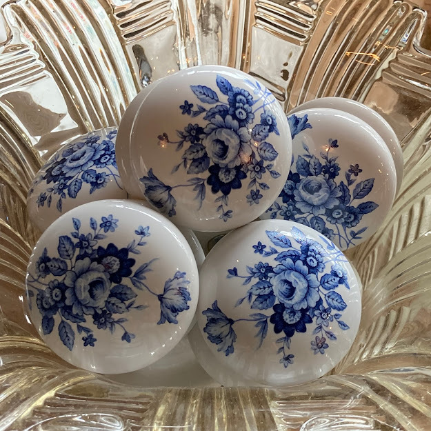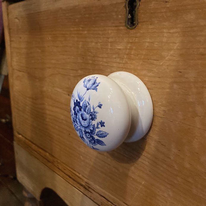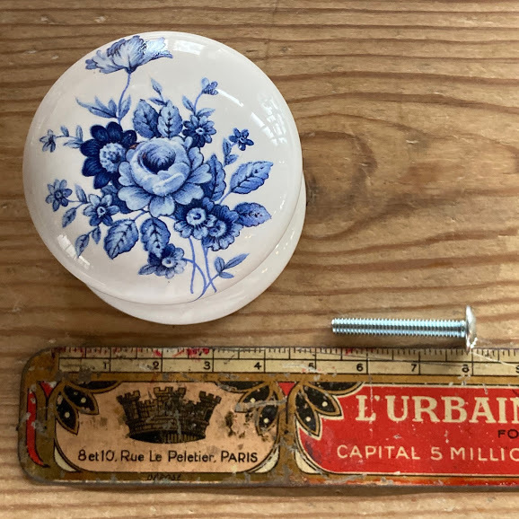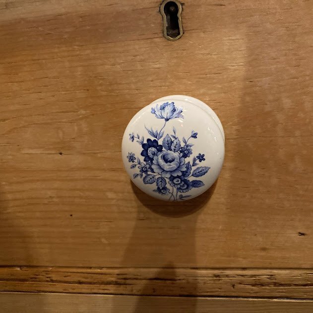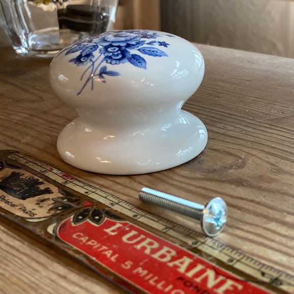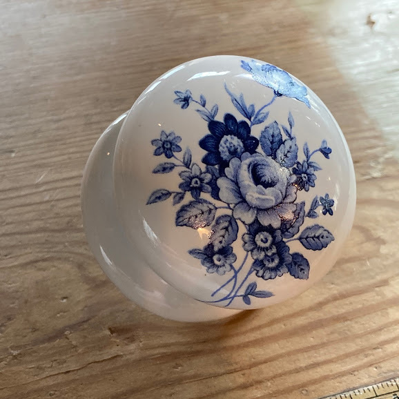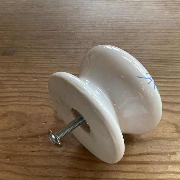 イギリスで買い付けました。陶器のつまみ(大サイズ)です。こちらはアンティークではなく新しい商品となりますが、陶器の白地に青色で描かれたヨーロッパらしいお花の模様が可愛らしい商品です。家具そのものを変えるのは大変ですが、つまみを変えるだけで印象がずいぶん変わってきます。お手軽なイメージチェンジにご利用ください。複数個在庫がございます。福岡市南区の店舗にてお渡しも出来ますのでお気軽にどうぞ!ゆうパック60でお届けいたします。破損の可能性があるためレターパック等でのお届けはできません。