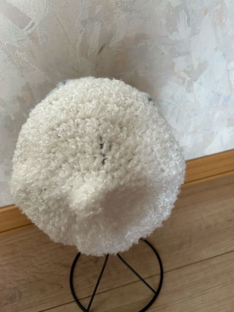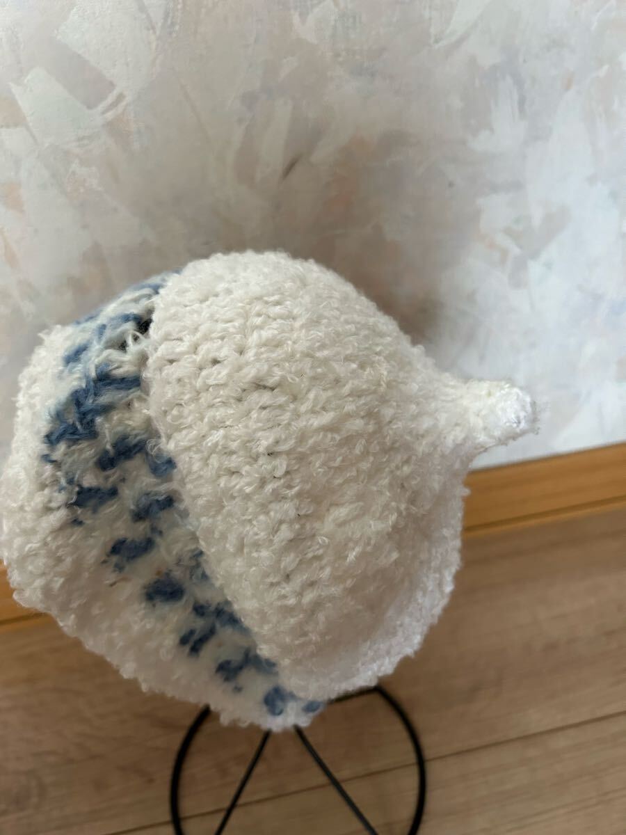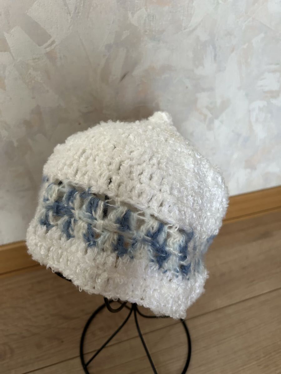 アクリルとモヘアの糸で編み込みの帽子を編みました