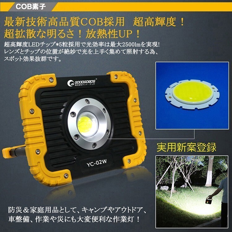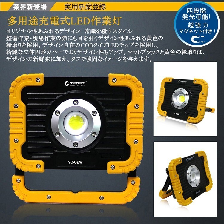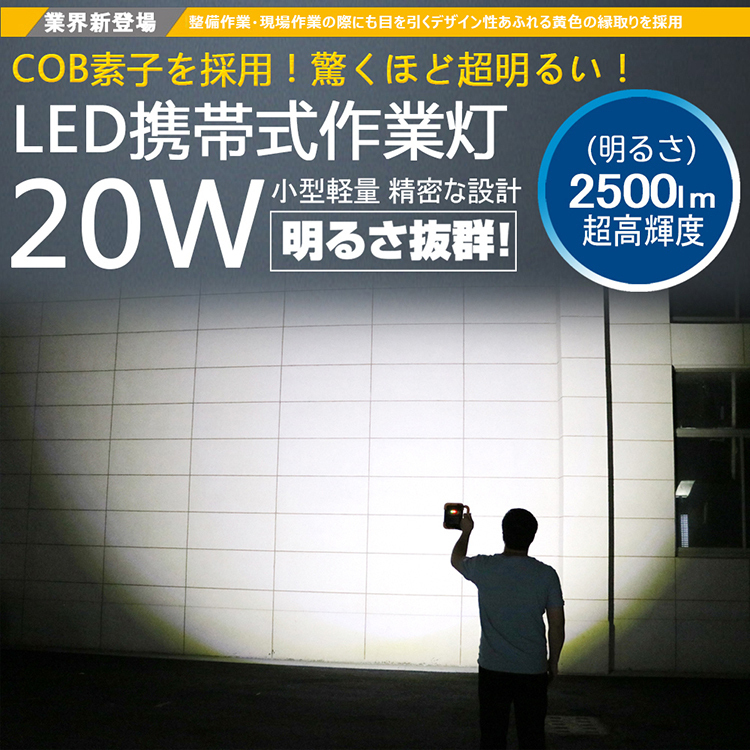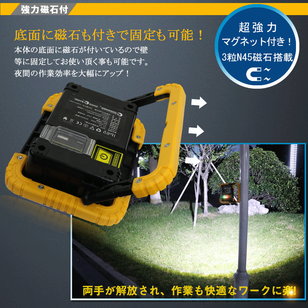 | ★オススメポイント★ 折り畳み式・マグネット付きの20w 充電式LED作業灯登場!折り畳み式・充電式で、コンパクト・軽量・経済的 機能:4モード点灯、折り畳み可能、マグネット付き、スマホに充電対応、バッテリー残量表示灯付き ●折り畳み式:コンパクト・小型なデザインで持ち運びに非常に便利です ・コンパクト:小型なデザインで重さが0.45Kg、カバンに入れても軽量なため安心。 ・小型且つ軽量化タイプなので、取手収納時サイズ(約)は直径17.16cm×厚4.59cm 。持ち運びに非常に便利です。 LED作業灯、ランタンと懐中電灯の機能を持ちます ●20W COBタイプLEDを実装して、直視できない程の眩しい光を照射。 LED COBチップが設置され、均一なひとつの面で発光するため、直視できない程の眩しい光を照射。 120°の広角照射と相まって、より幅広い範囲を真昼の如く照明できます。 ●ワンタッチで点灯4モード切替可能! ハイ・ロー・SOS・フラッシュ4モードを搭載! ハイ・ローモード:使う場所や時間帯によって用途に合った使い方ができる。 SOS・フラッシュモード:イザというときに役に立つ! 稼働時間:ハイ/3時間、ロー/6時間 ●強力マグネット付きで様々なシーンで活躍すること間違いなし! マグネットが付いており、鉄などの金属に吸い付けます。引っ掛けて使用する事もできます。 作業するとき、両手が解放され、作業も快適なワークに楽! 前後180度の方向が調節することができます。照明の方向が調整することができます、仕事のときには働きやすいです。 ●耐衝撃、耐振動、丈夫な設計で安全、安定性、信頼性の高い! 2Mからの落下にも耐える丈夫な構造で手の不注意で商品を落とす不安不要! ●設計にヒューマナイズ!バッテリー残量表示灯&充電表示灯を搭載! 電量残量表示灯と充電量指示灯を組み込んだ設計です。表示は25%、50%、75%、100%の4段階です。 電池電力表示ライトも付き、電力が少なくなることがすぐに分かるため予め充電準備可能。 ●モバイルバッテリー機能:スマホや携帯などに充電対応できる USBコネクターを連続して、USB給電可能なiPhone、iPad、スマホ、Tablet、WiFiルータ、ゲーム機等の充電が可能。 ※USBで利用して充電できるなら全部OKです。 ●IP65防塵防水規格 PC材質を強化しIP65相当の防塵・防水性能を保証、雨の当たる屋外や粉塵の多い環境でご使用頂けます。 用途 整備工場・板金塗装工場・アウトドアなど・電源の無いところ大便利! 作業用:倉庫作業、自動車整備、ガレージ、物置、電設工事(天井裏工事)、リフォーム建築などの照明として。 アウトドア用:キャンプ、バーベキュー、登山、夜釣り、ペットの夜間散歩などの照明として。 常備用:停電対策、災害の備えに。 |