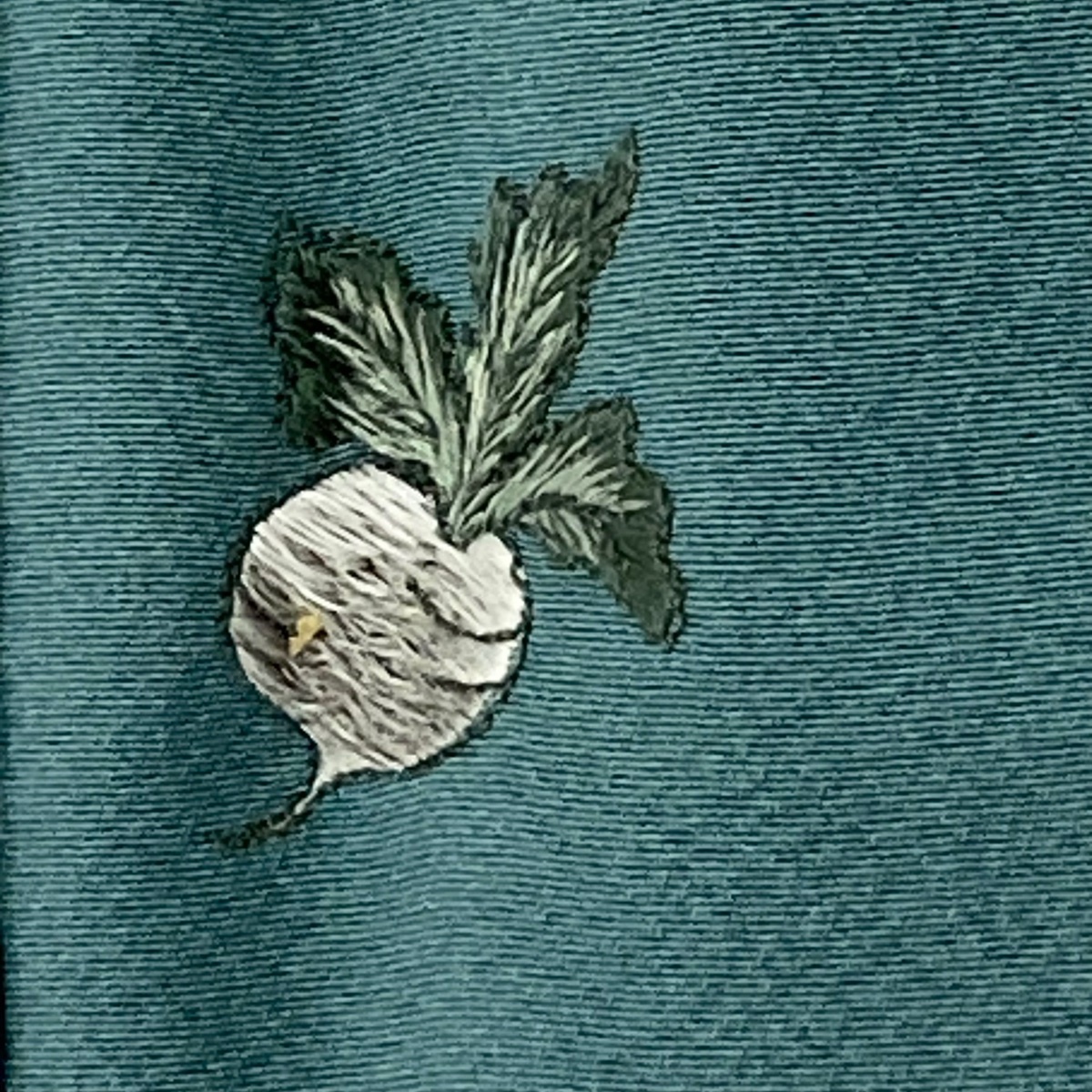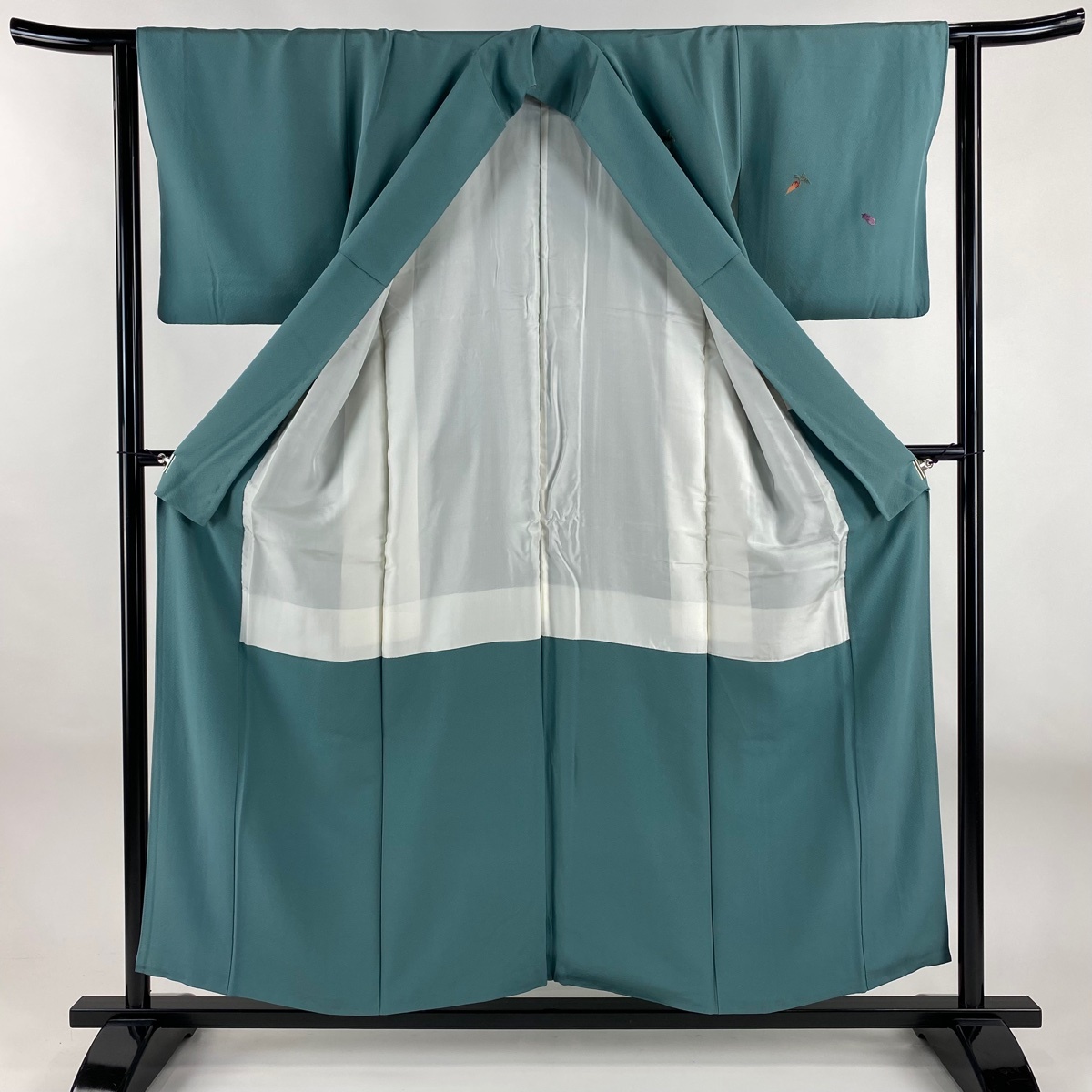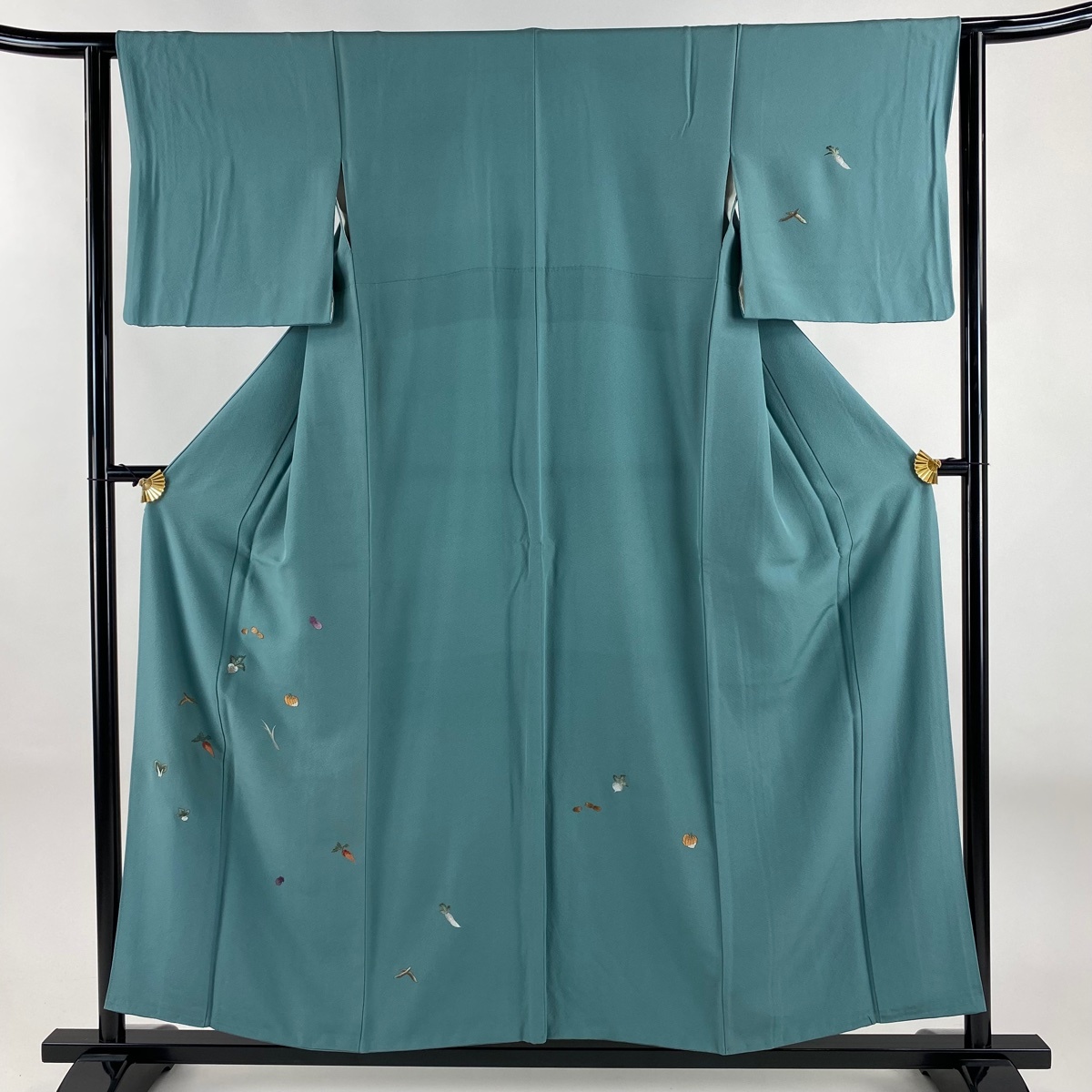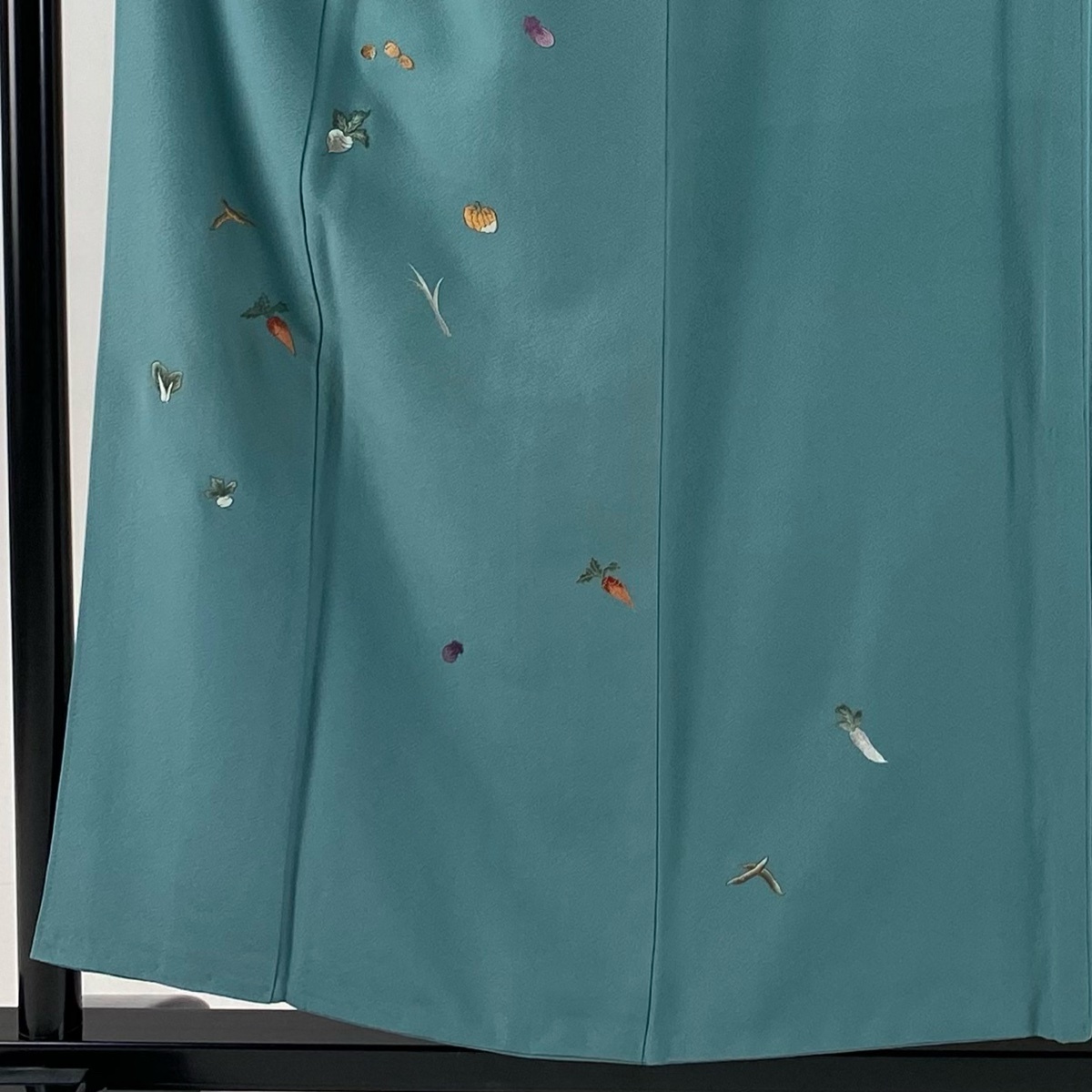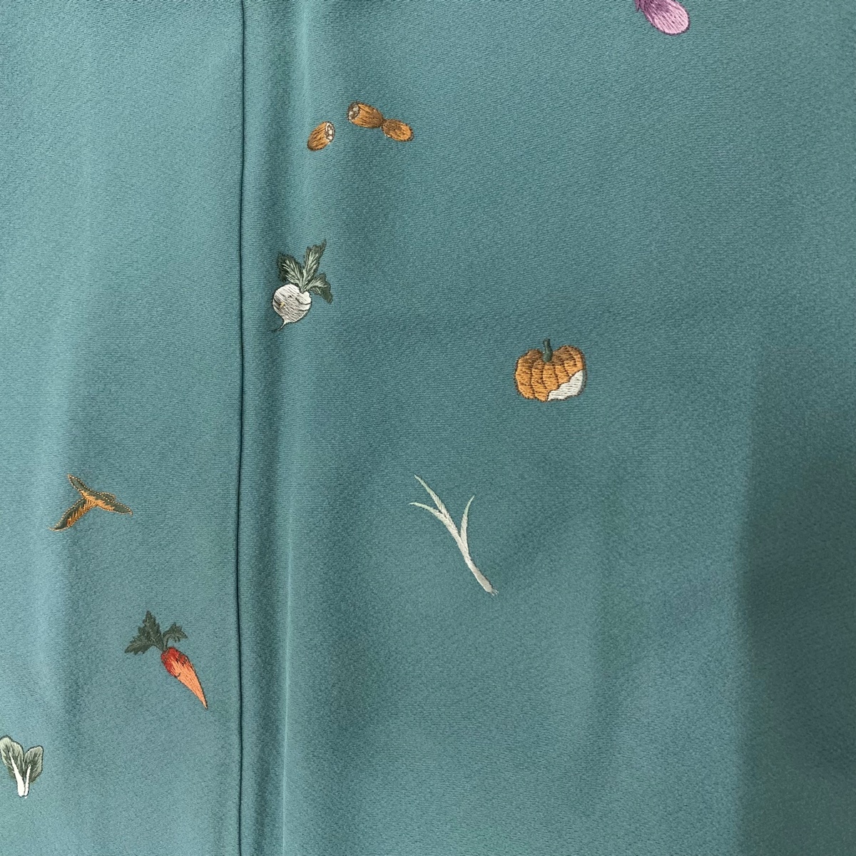 | 付下げ 名品 野菜 かぼちゃ 刺繍 青緑 袷 身丈155 裄丈62 S 正絹 【中古】 |