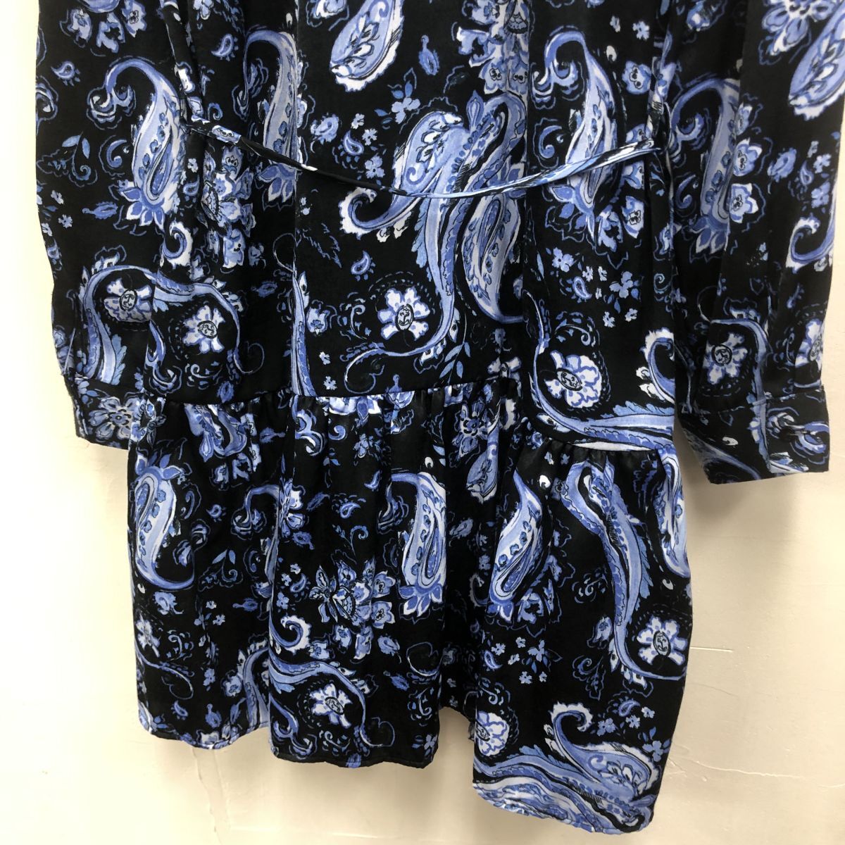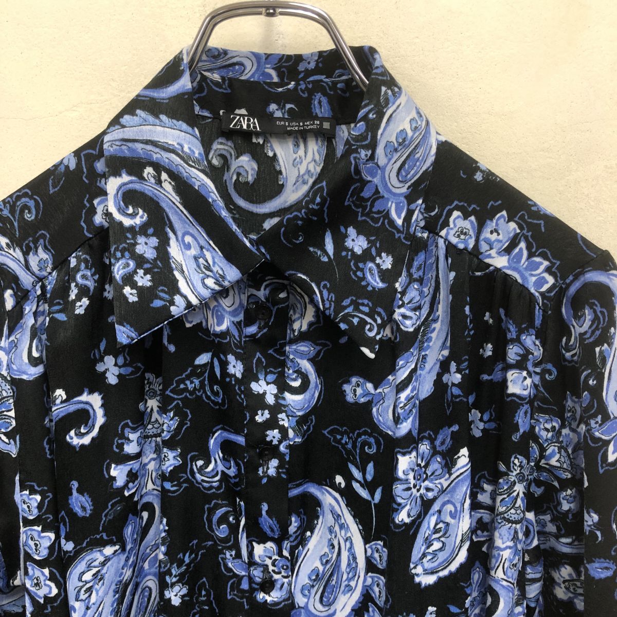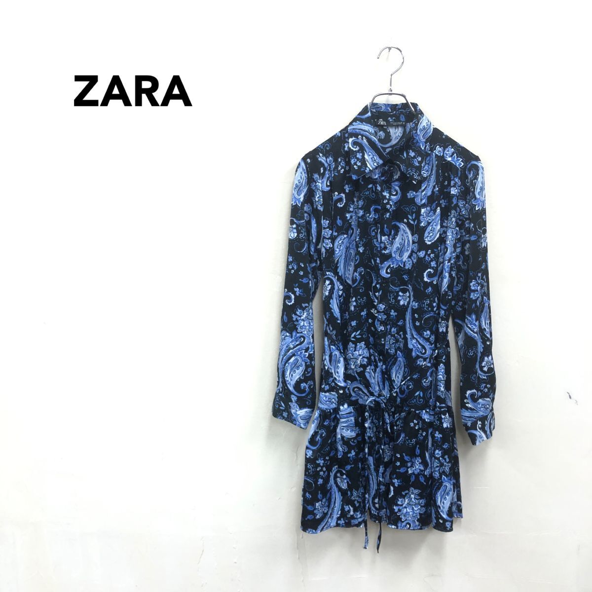 2O2509-K◆ZARA ザラ 長袖シャツティアードワンピース◆sizeS ブラック 花柄 薄手 とろみ感 光沢 カジュアル 膝上丈 レディース