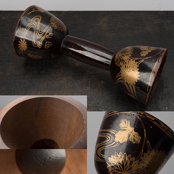 | 時代の蒔絵小鼓胴。江戸期の作と思います。 請の鉋目は、見たことがないほど細かく施されています。 請に墨書きありますが、判読できません。 サイズは直径約99-100mm、長さ約235mm。 重さは436gです。家庭用秤での測定ですので多少の誤差あります。 全体に塗り剥げがあります。 画像で丸印をした箇所に直しがあります。 使用による、スレ・アタリ等あります。 状態、詳細は画像でご確認ください。 |