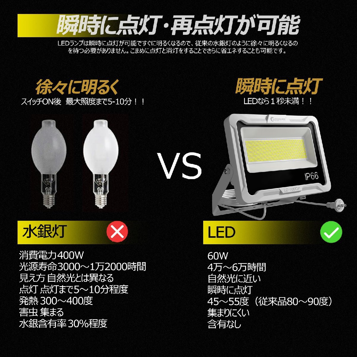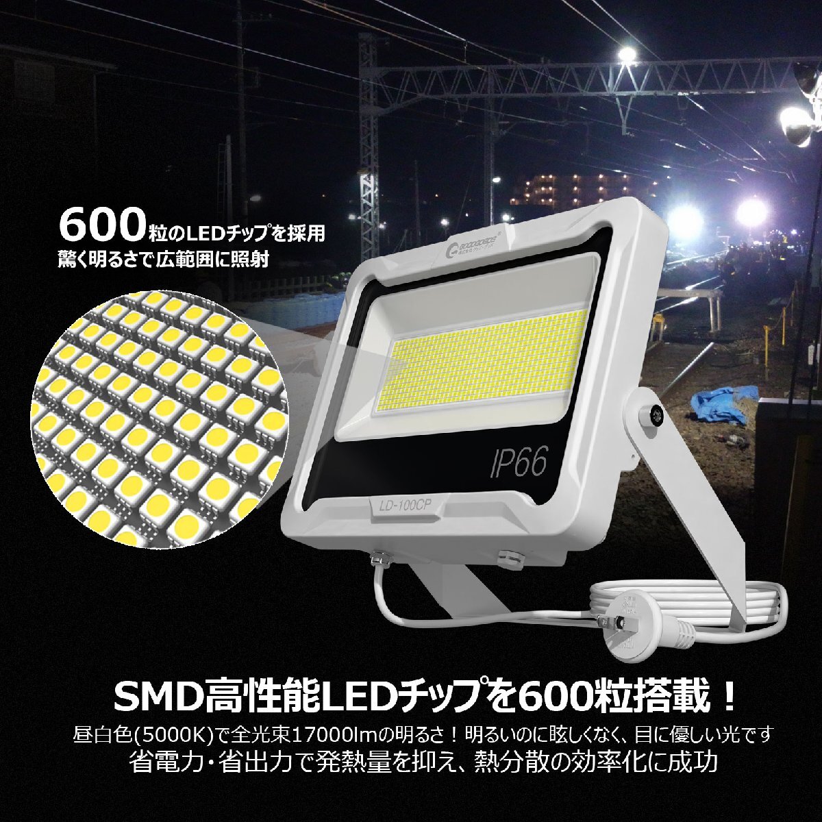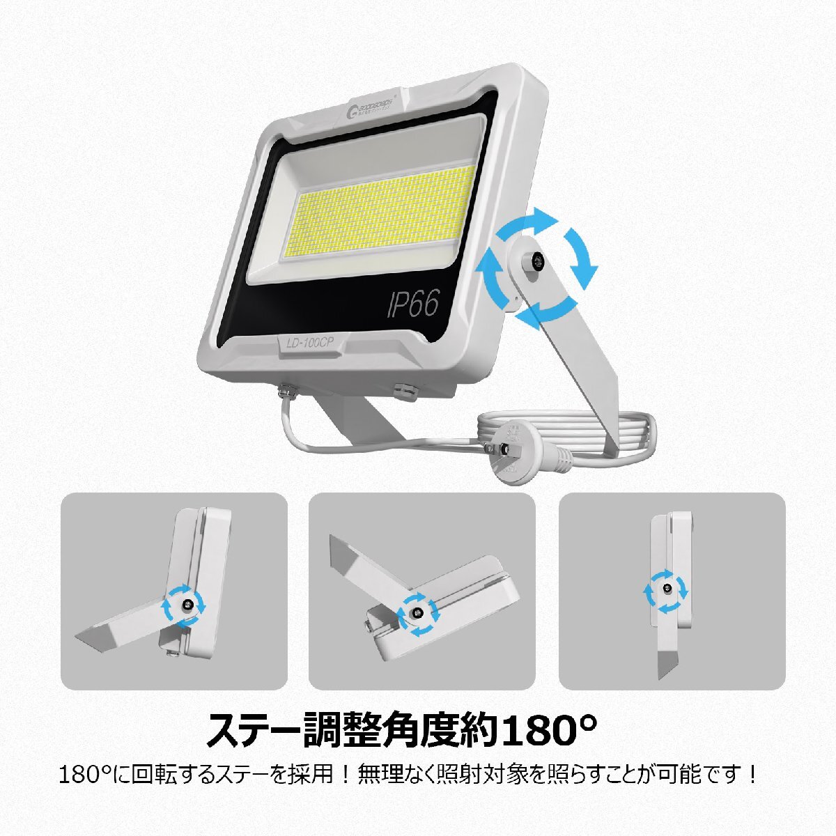 ![]() ![]() ![]() ![]() ![]() ![]() ★オススメポイント★ 独創的な自社オリジナルデザイン! 市販品や旧型仕様とは異なる、当社オリジナルデザインのLED投光器です。 家具のモールディングのようなデザインで重厚感・オリジナル性を実現しました。 オリジナル設計のステー形状! ステーには、量産品では手間のかかる加工を施しています。 ステーの設置面に傾斜をつけた事で、ステーを取り外すことなく壁面に取り付けすることができ、施工時間や手間を大幅に削減できます。 また、ステー角をまるで折り紙のように角度をつけることで、デザイン性だけでなく、荷重が分散され耐風・耐震性能が向上しました。 600個SMD高光効LEDチップを使用!100W投光器の初採用! 小出力のLEDチップを採用することでチップの発熱量を熱発散しやすくしました。 LED周辺の熱だまりを防ぎます。 一体型放熱フィンデザインを採用! 耐熱アルミを贅沢に使用し、更に大きな櫛型フィンデザインで放熱性能アップ! 連続点灯3時間を超えた際の筐体温度は50度前後を維持!製品寿命の向上に繋がります。 結露防止用のフィルター採用! 筐体の底部には、防水性能はそのままに筐体内のわずかな水分を逃がす通気弁を設けました。 過度な湿度を逃しガラス面の結露・水だまりによる故障を防ぎます。 耐熱アルミ素材・一体型放熱フィンデザインを採用! アルミ合金素材を贅沢に使い、従来品より耐久性は格段に向上しています。 また、製品の材質だけでなく、その設計や加工技術により製品寿命を大幅に引き上げることを実現しました。 ステーは最大約180度調整可能 ステー接続部にはボルト2個を採用し、可動式となり、安定性そのままに、簡単に角度調整が可能です。 最大約180度調整可能で、あらゆる設置方向で対応できます。 IP66防塵・防水基準もクリア 厳しい環境にも耐える防塵・防水仕様で頑丈ボディで、屋外でも安心してご利用いただけます。 用途 ●工場・倉庫などの高天井照明 ●建設土木工事、道路工事など現場用作業灯 ●大型サインボード・駐車場・演出照明などに ●施設・店舗・建築外観・屋外向けのLED照明 ●多目的施設